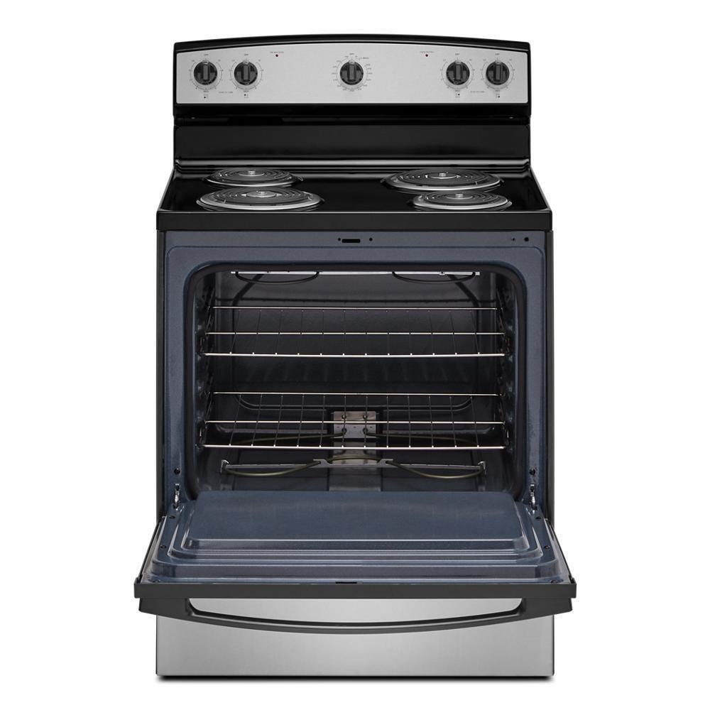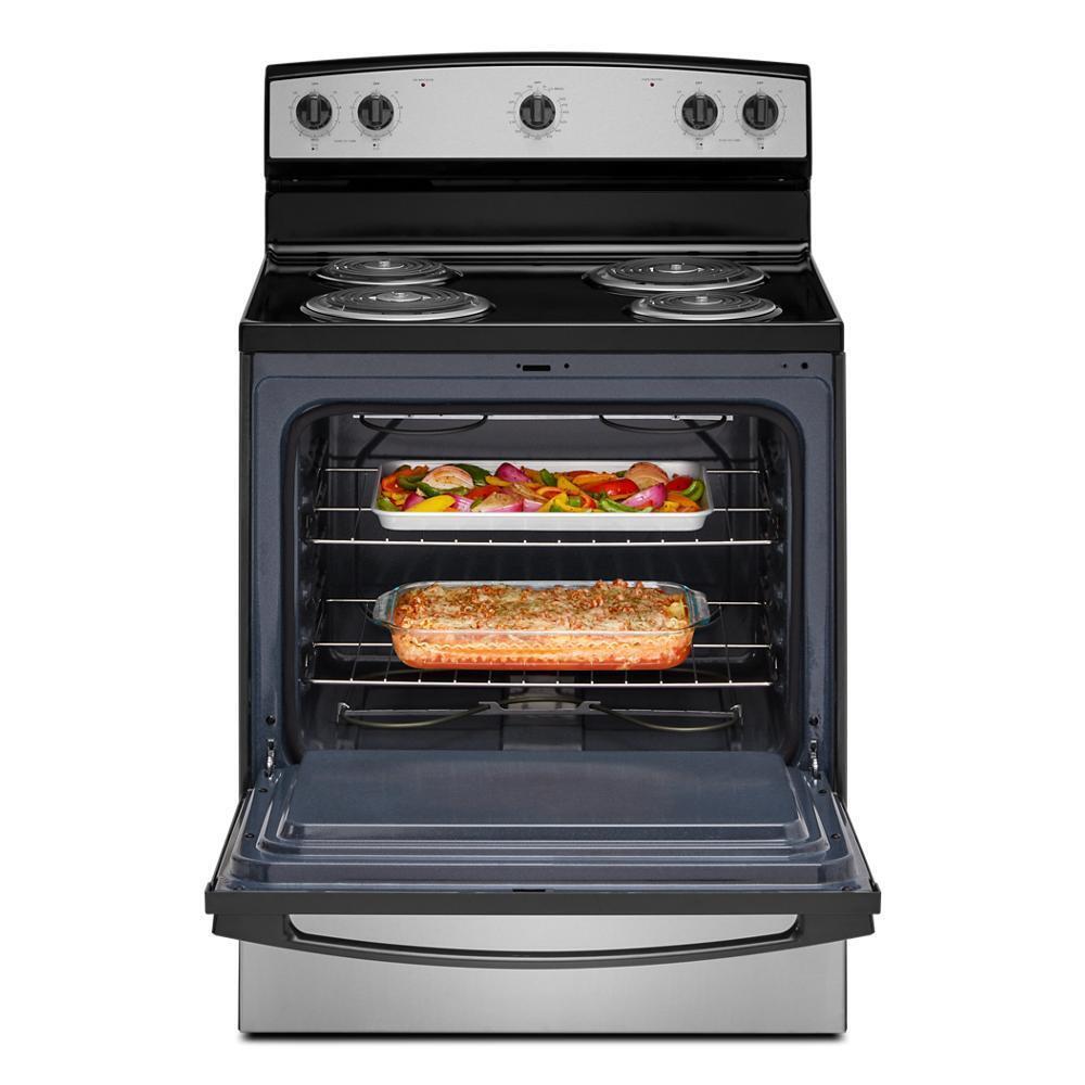 This Amana® electric range makes delicious meals, without difficult clean-up. Splatters won't matter with the Easy-Clean Glass Door that helps messes wipe away easily. The versatile cooktop features the SpillSaver UpSwept™ Cooktop, so you can go ahead and spill the beans, and the large oven capacity means there is room for dinner and dessert to cook at the same time.