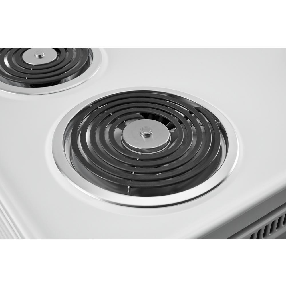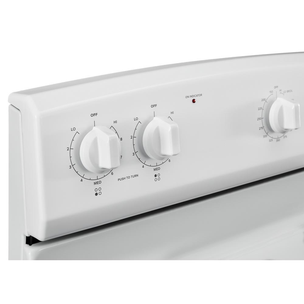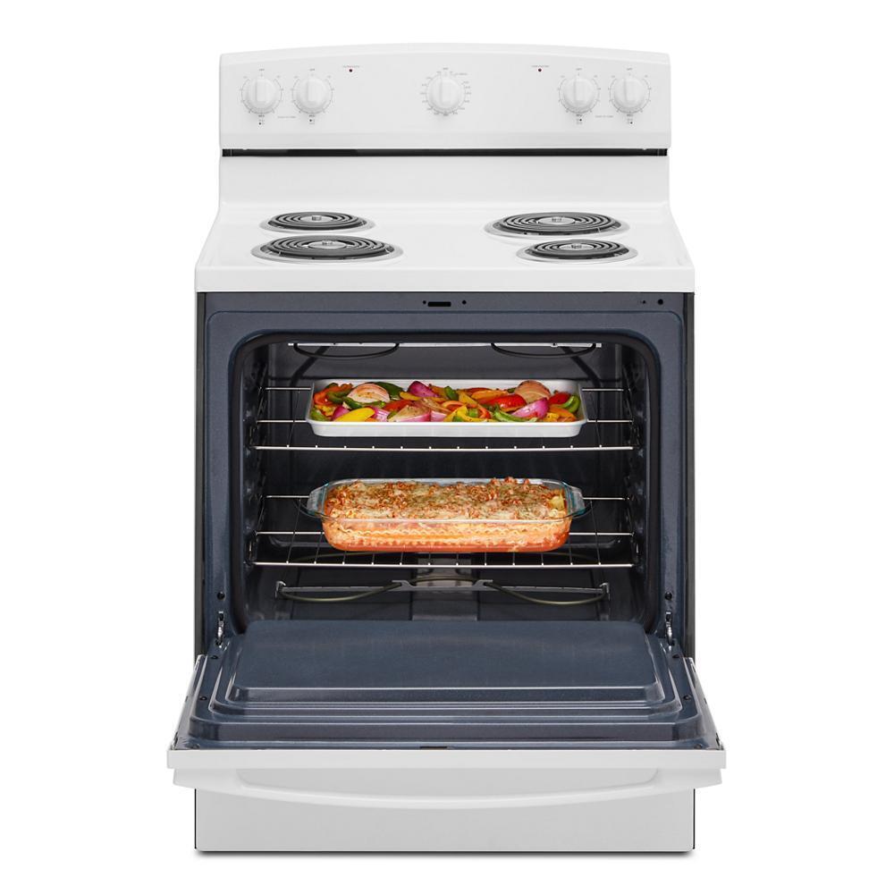 This Amana® electric range makes delicious meals, without difficult clean-up. Splatters won't matter with the Easy-Clean Glass Door that helps messes wipe away easily. The versatile cooktop features the SpillSaver UpSwept™ Cooktop, so you can go ahead and spill the beans, and the large oven capacity means there is room for dinner and dessert to cook at the same time.