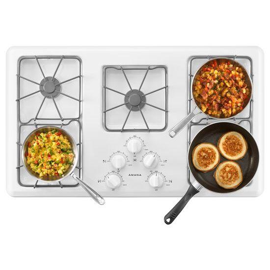 Make a full menu at once with this 36-inch Amana® Gas Cooktop that installs over your wall oven. With 5 Burners featuring up to 12,500 BTUs, you get the right amount of cooking power. Front Controls are within reach so you can adjust the heat with ease. Plus, cleaning is a breeze with Sealed Burners that keep spills from spreading.