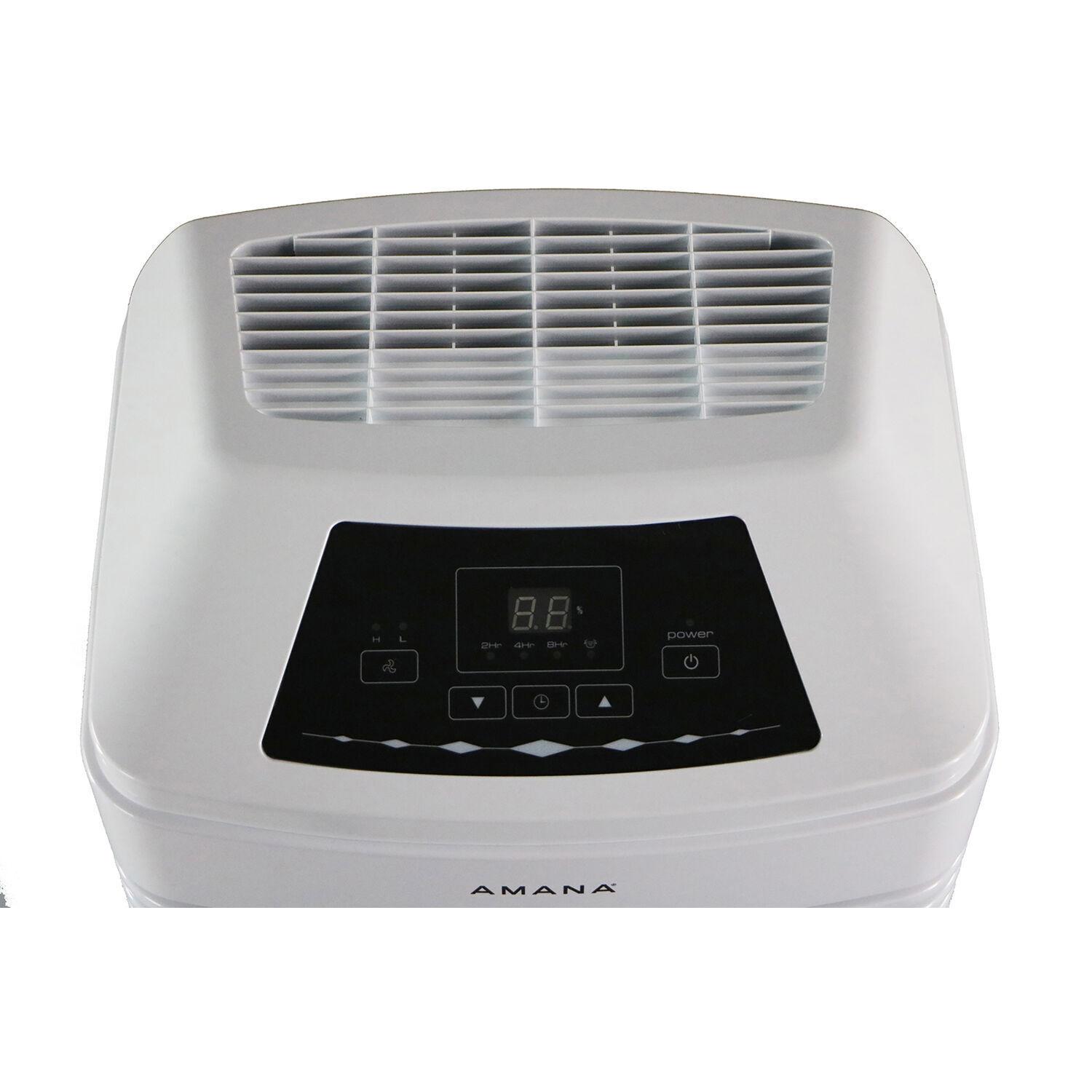 Removes 48 pints of moisture per day: The Amana 48-pint portable room dehumidifier gets rid of condensation by removing up to 48 pints of moisture from the air per day. With a removeable, washable dust filter for easy maintenance, you ll ensure that you re always getting the most out of your unit. Adjust to your own comfort level: As the perfect solution to clammy indoor environments, the adjustable humidistat allows you to customize your space to remove dampness and experience maximum comfort. Equipped with touch controls, an LED display, 2 fan speeds, and a 24-hour on/off timer, the Amana 35-pint dehumidifier features a variety of settings for your own customization. Ideal for any indoor space: With minimal noise, the machine works quietly to remove moisture from any room in your home or office without disruption to your daily life. Perfect for your basement, bathroom, apartment, office, bedroom, attic, laundry room, and more, the 4 easy-rolling caster wheels and integrated side handles allow you to easily transport the dehumidifier to any space, providing relief when and where you need it most. Reduces household allergens: For those prone to household allergens like mold and dust, the Amana 48-pint unit is an excellent way to reduce these irritants in damp areas of your home.