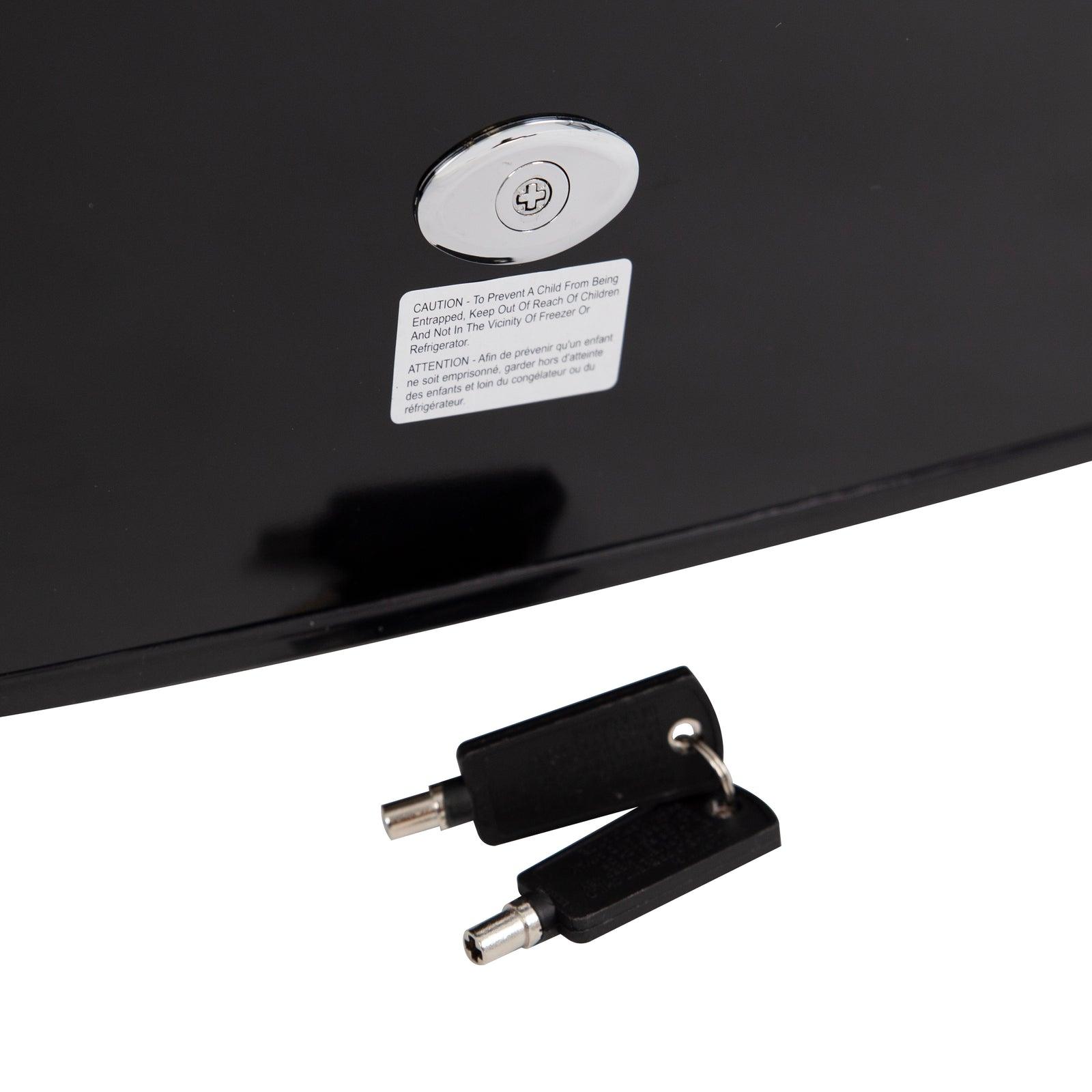 Keep your snacks and favorite beverages close by in the compact, 4.4 cubic foot refrigerator from Avanti. The perfect lockable mini fridge for the office, dorm, man cave, she shed, bar, bedroom, or anywhere you need a little extra refrigerator space. The door shelves can accommodate 2-liter and gallon bottles and six 12 oz. cans, as well as other drinks and condiments. Use the adjustable, removable glass shelving to arrange salads, fruits, snacks, and other foods for easy access throughout the day. This compact fridge features automatic defrost so your foods remain fresh and cold. Select the right settings for your items with the full range temperature control.