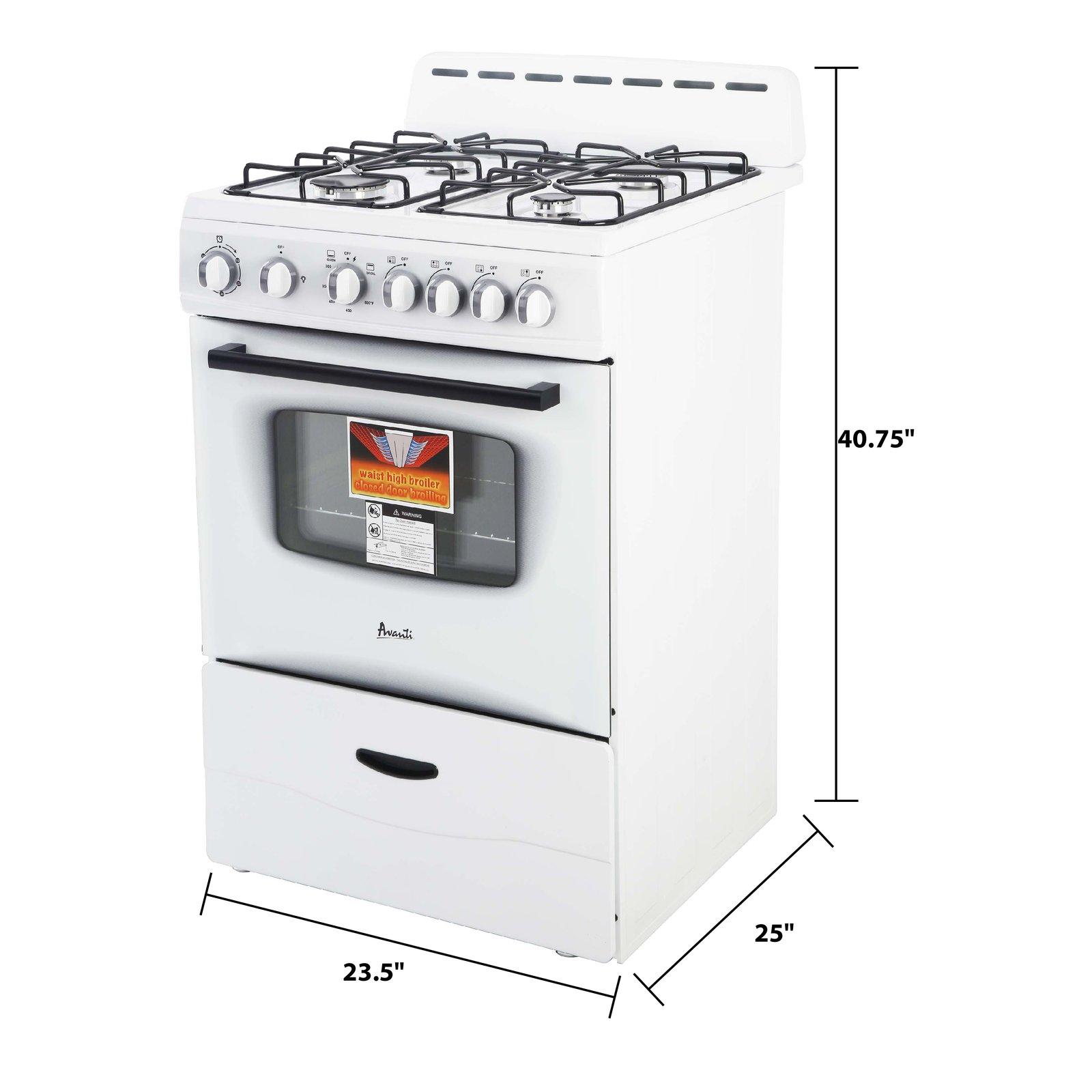 Save kitchen space with this compact range from Avanti. The perfect compact gas range for the office, studio apartment, RV, tiny home, condo, vacation home, or anywhere you need to save space in a small kitchen. This 24-inch wide range features 4 sealed burners (1 rapid, 2 semi-rapid, and 1 simmer). The oven has a storage drawer at the bottom and a broiler that comes with a broiling pan.