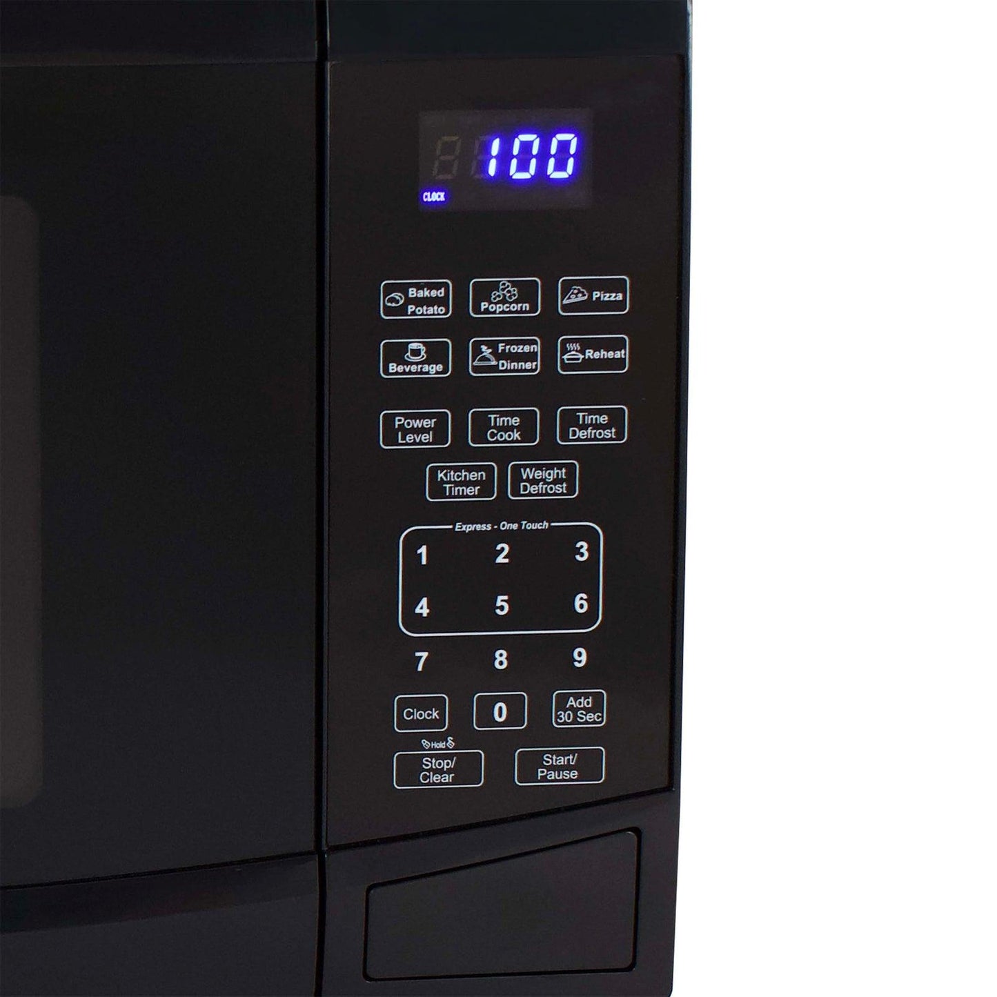 - Six one-touch, pre-set cooking modes (Baked Potato, Popcorn, Pizza, Beverage, Frozen Dinner, Reheat)