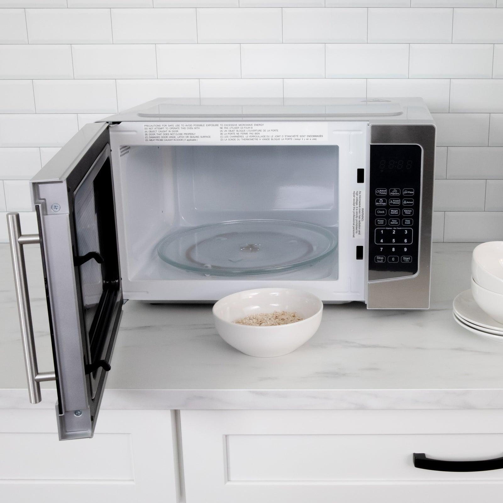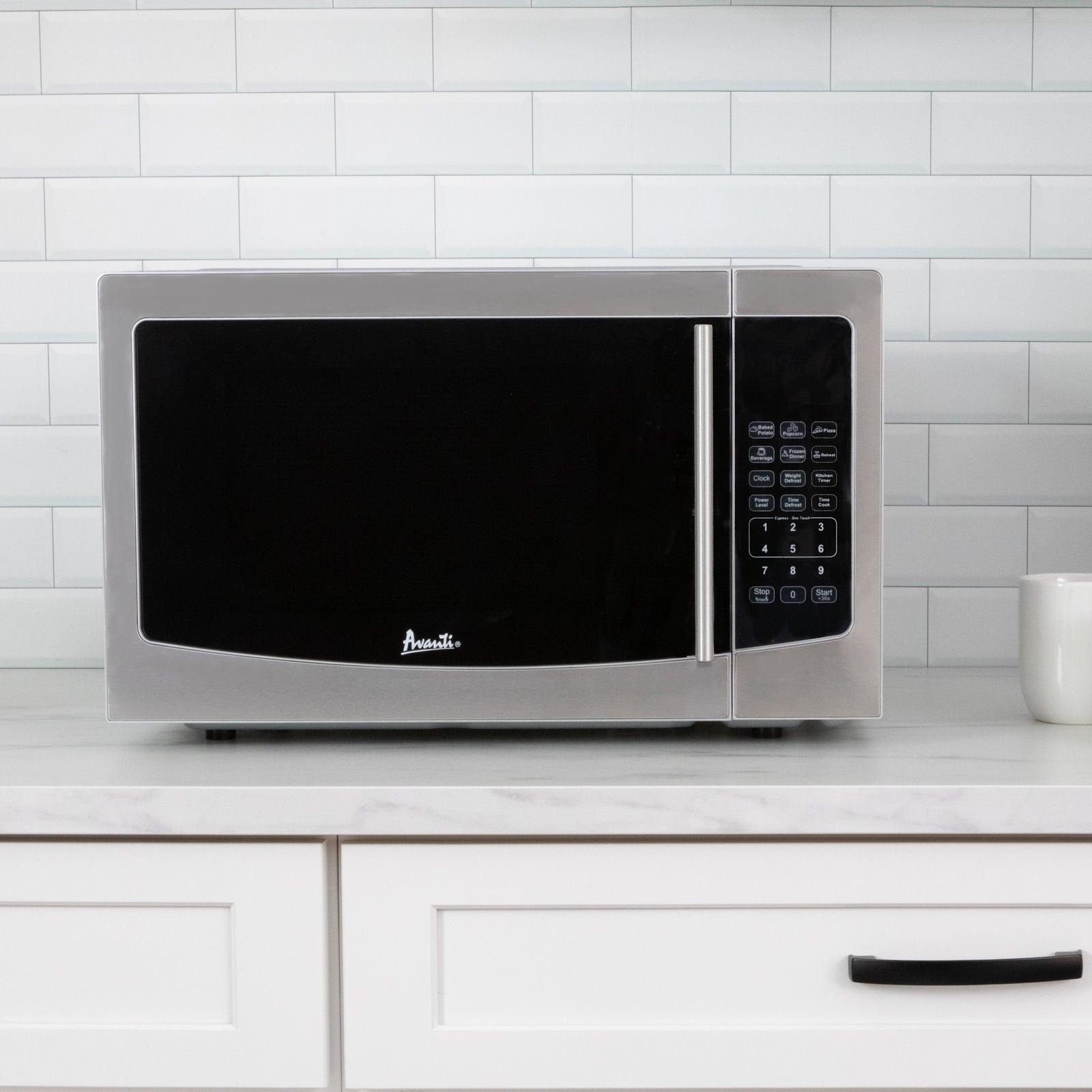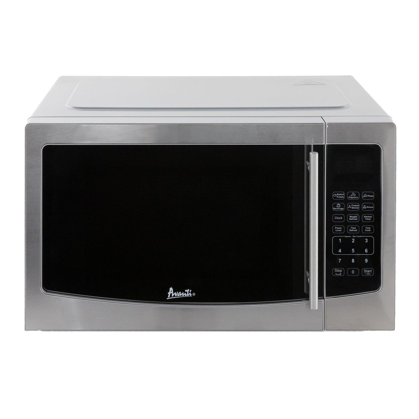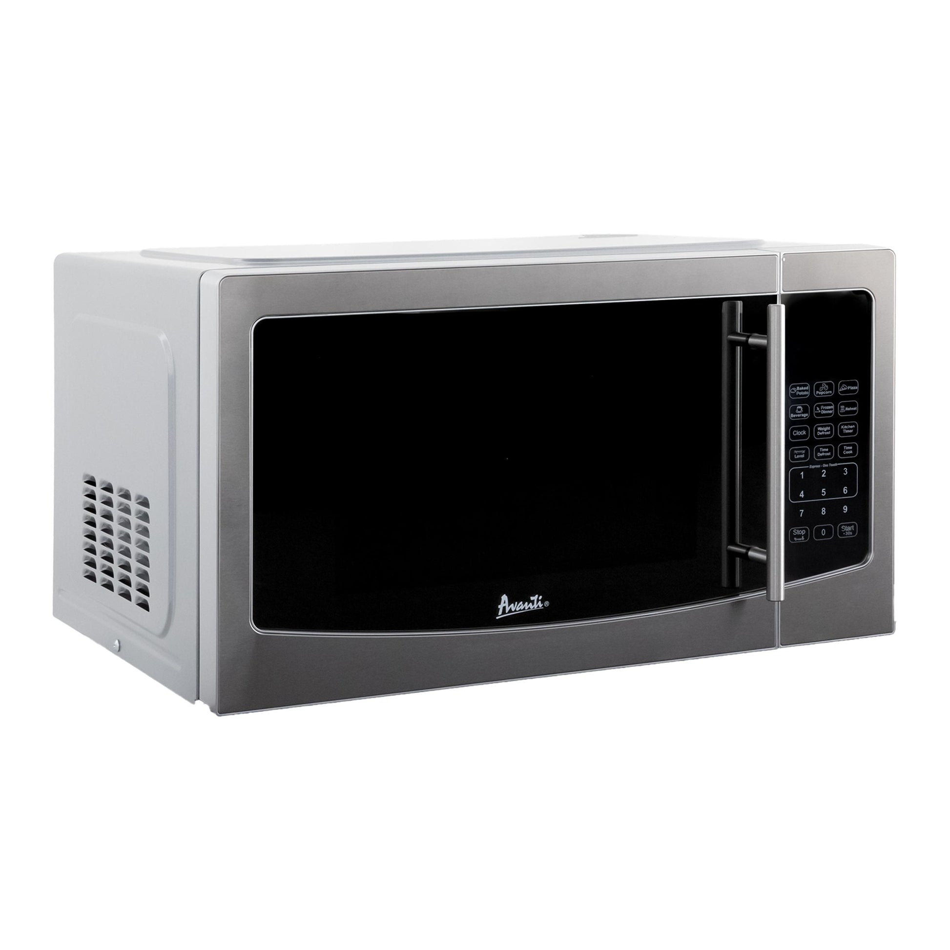 Save counter space with this compact, 1.1 cubic foot, stainless steel microwave oven with mirrored door from Avanti. The perfect countertop microwave for the dorm, man cave, office, studio apartment, RV, tiny home, rental room, condo, vacation home, or anywhere you need to cook food fast. This small microwave features 1000 watts of cooking power, an electronic control panel, 6 pre-set cooking settings (baked potato, popcorn, pizza, beverage, frozen dinner, reheat), and a removable, glass turntable all in its compact footprint that fits perfectly on the countertop. Covered by the Avanti One-Year Limited Warranty.