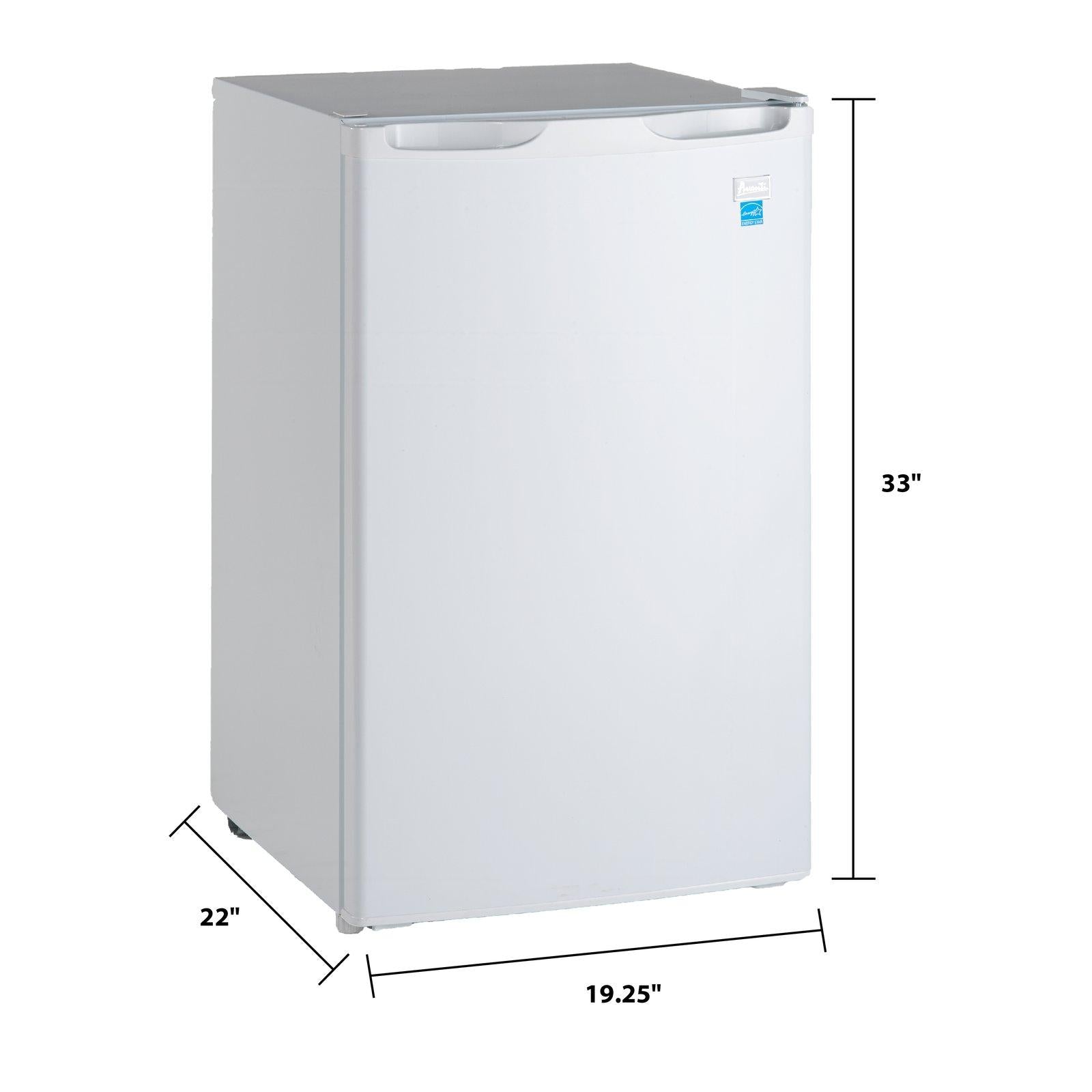Keep your snacks and favorite beverages close by in the compact, 4.4 cubic foot refrigerator from Avanti. The perfect mini fridge for the office, dorm, man cave, she-shed, bar, bedroom, or anywhere you need a little extra refrigerator space. The 1 full-width and 2 half-width door storage bins can hold up to 6 standard size cans, and the lower bin storage can hold a gallon-sized bottle. Use the adjustable slide-out glass shelves to arrange salads, fruits, snacks, and other foods for easy access throughout the day. This compact fridge features manual defrost, so your food and beverages remain fresh and cold. Select the right settings for your items with the adjustable thermostat control with push-button to defrost mode.