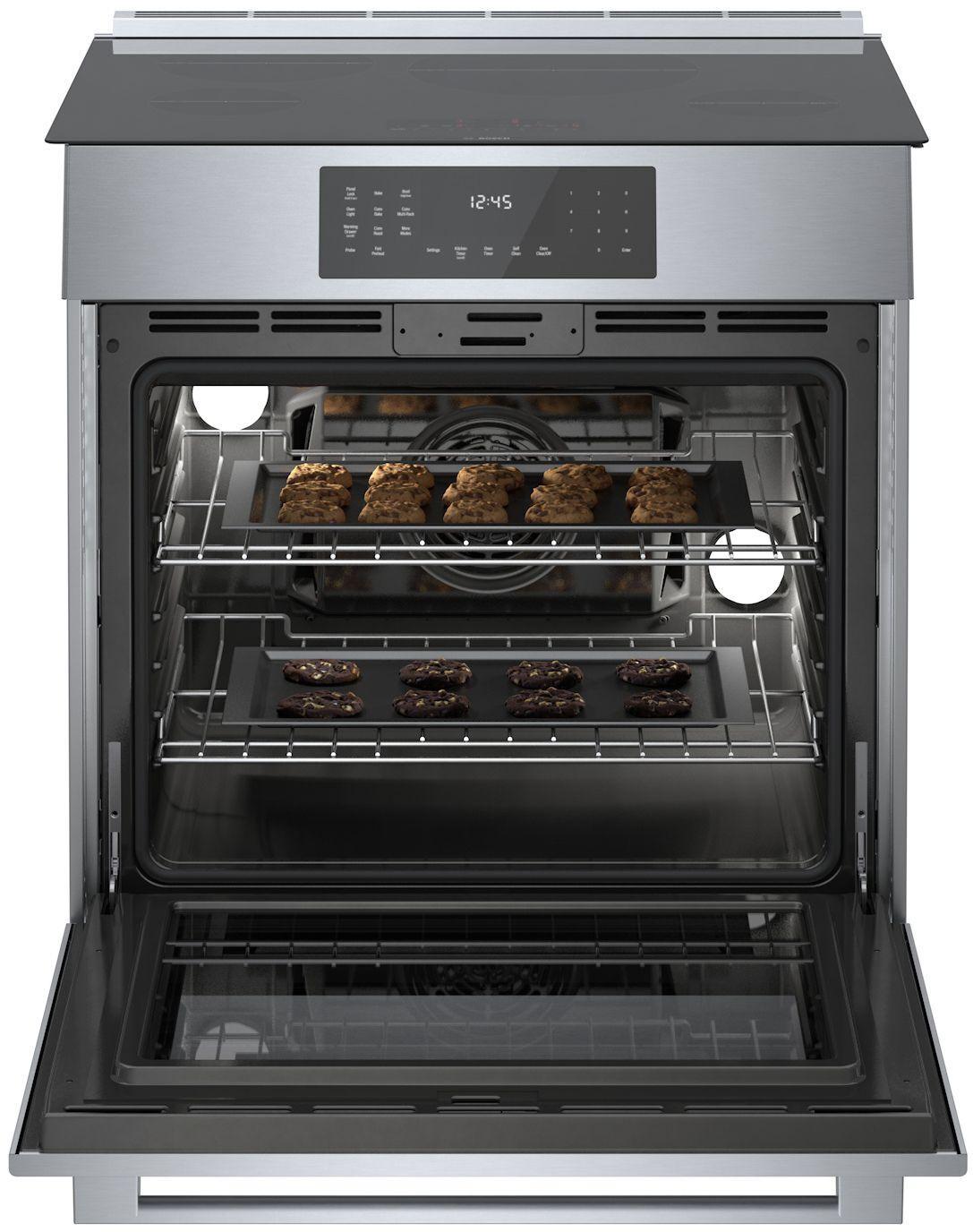 The Bosch 800 Series 30" stainless steel induction slide-in range delivers timeless style and premium cooking technology. Induction technology cooks faster than gas, and the smooth glass surface is easy to clean. The oven has a self-clean function for easy clean-up. For added convenience, a warming drawer keeps food warm until they're ready to serve.