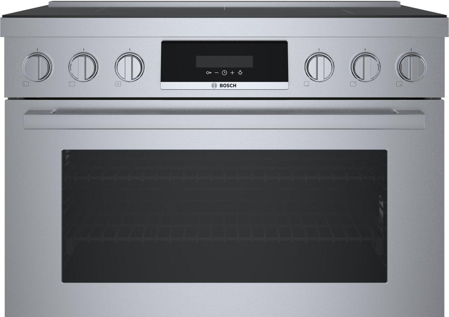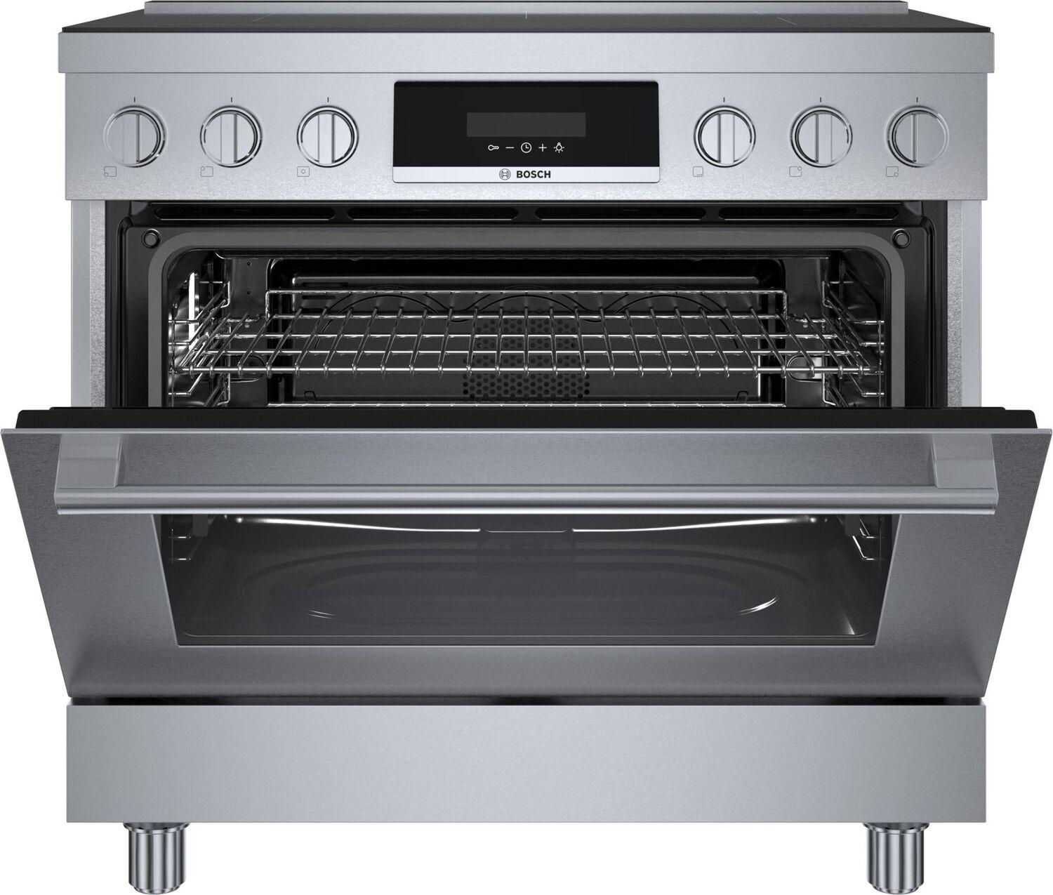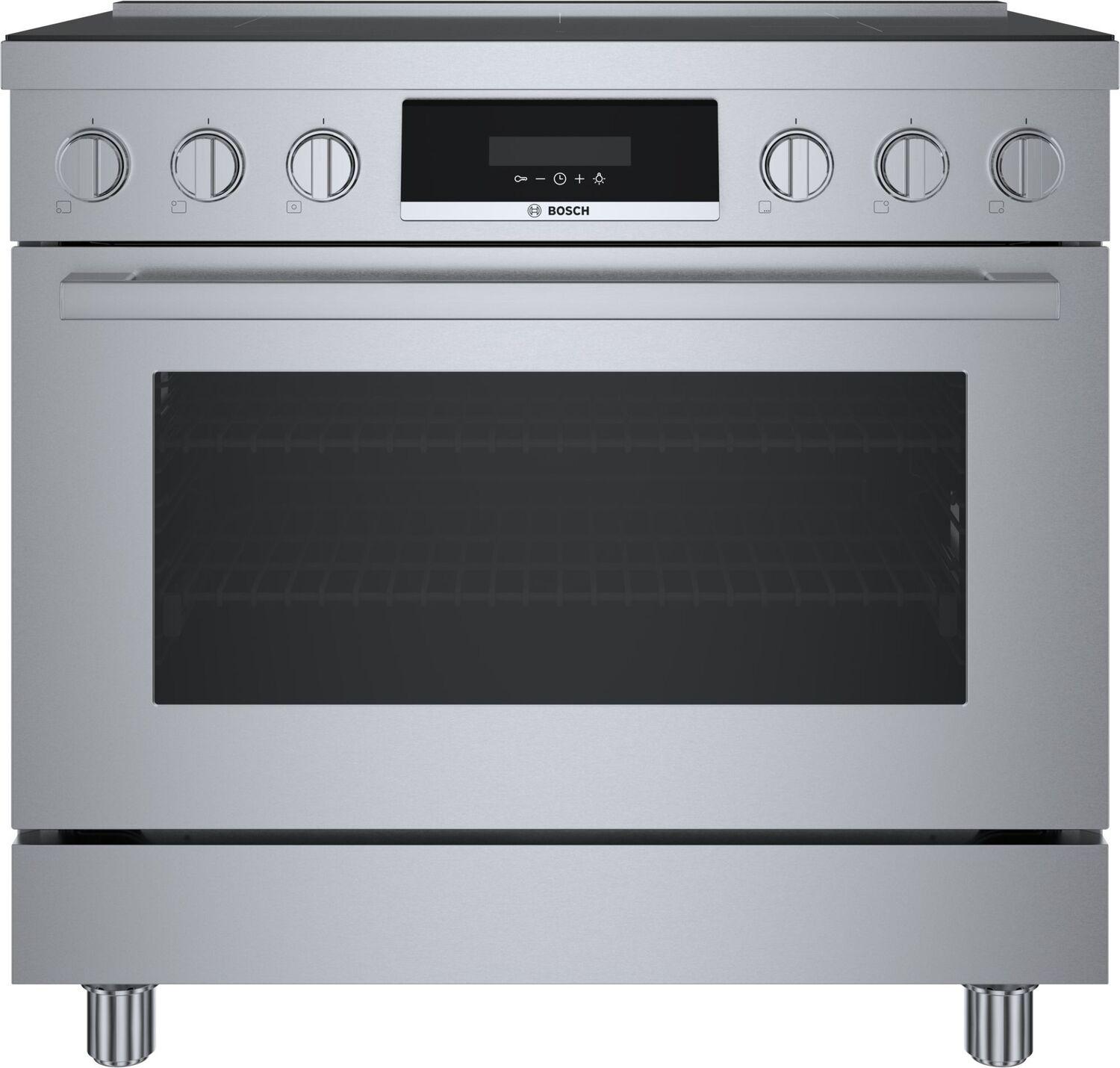 The Bosch 36" 5 element industrial-style induction range delivers Bosch's best in class cooktop power in a commercial-inspired design. Five powerful induction elements cook food quickly and precisely and the All-in-One oven combines your favorite kitchen tools into one appliance. Sear and saute with ease using the center power burner, which has Bosch's most powerful element at 5500W. The CombiZone feature allows you to combine two cooking zones into one, for larger pans. Sleek and modern, the edge to edge glass induction surface is also easy to clean.