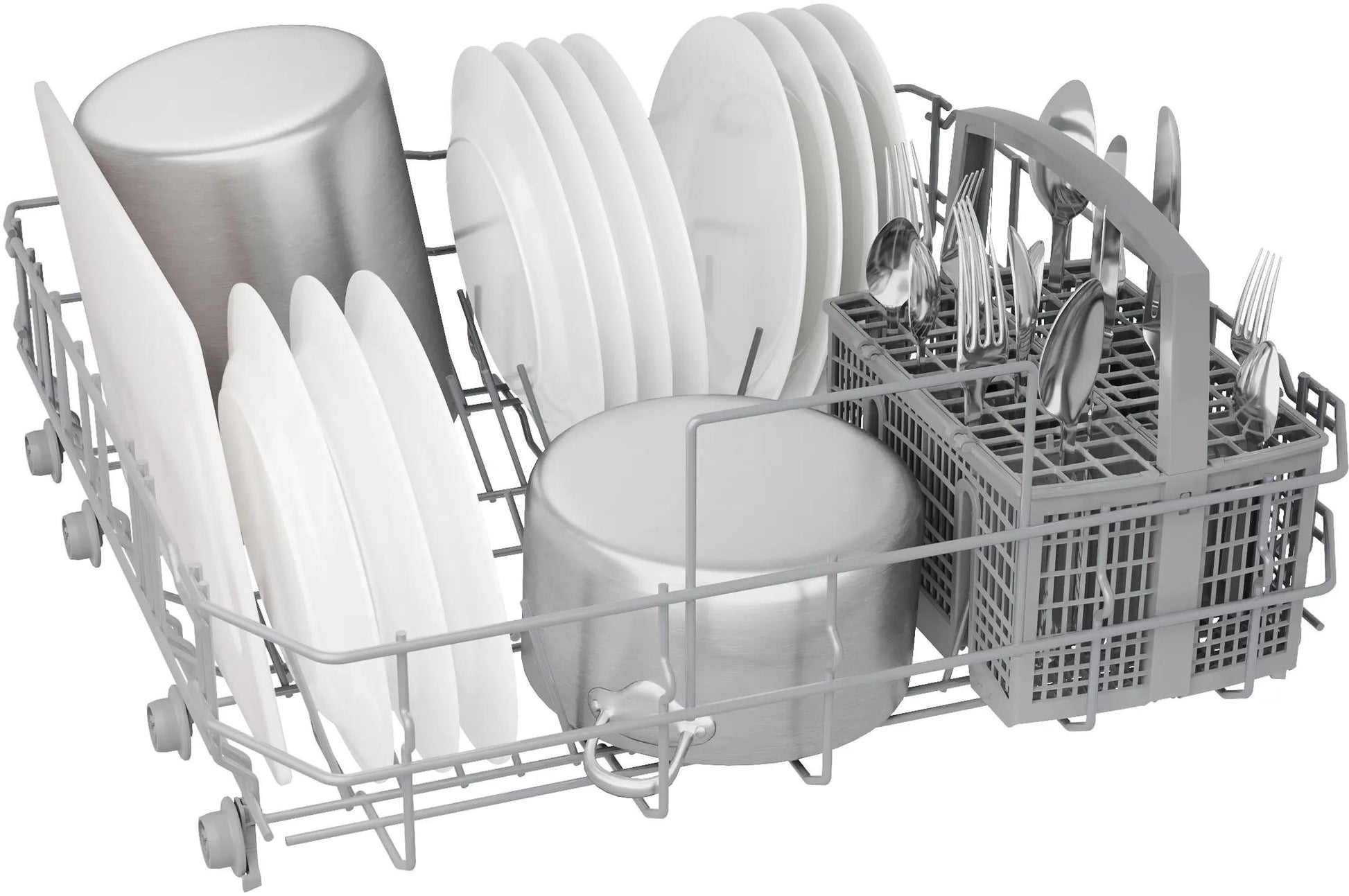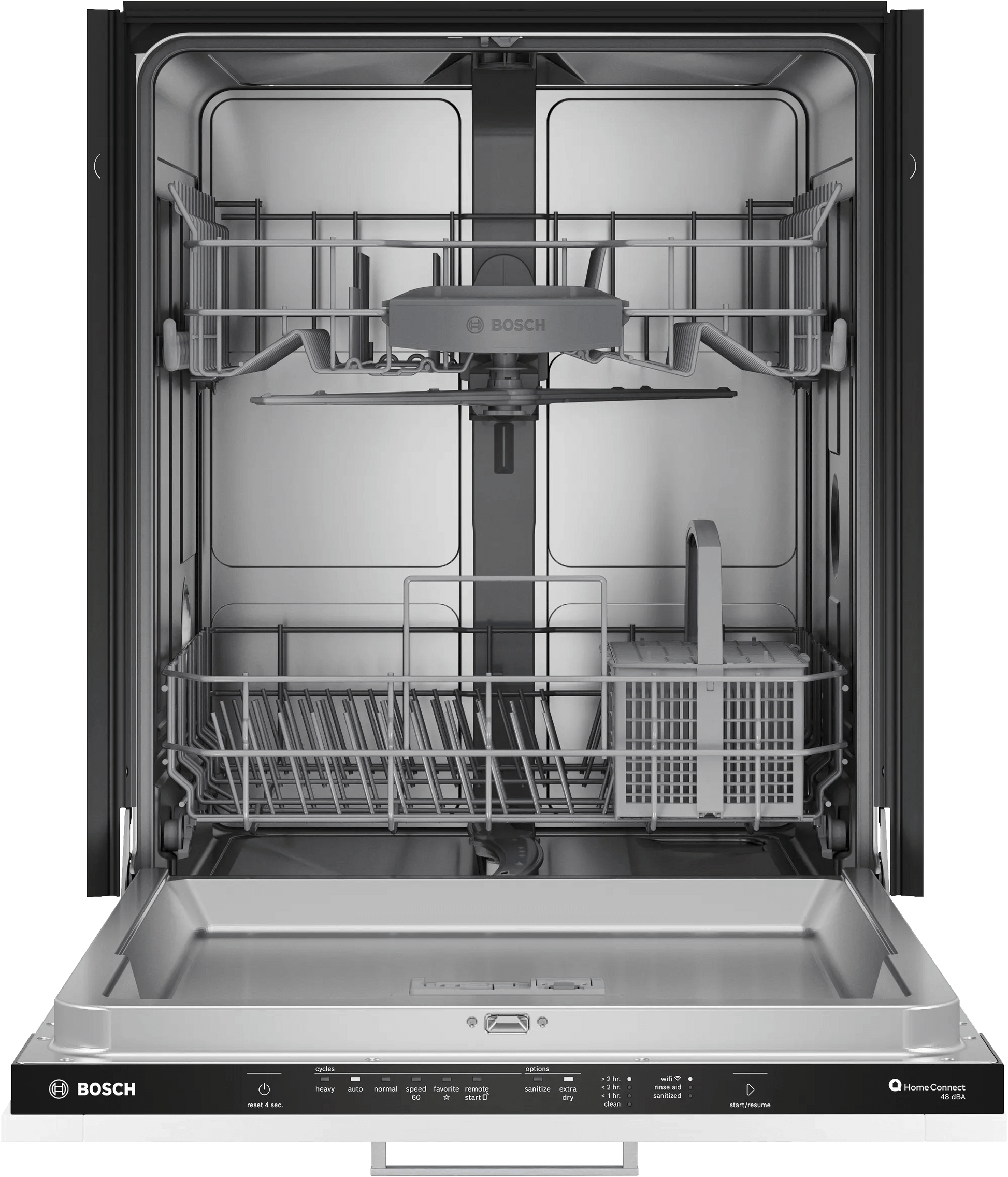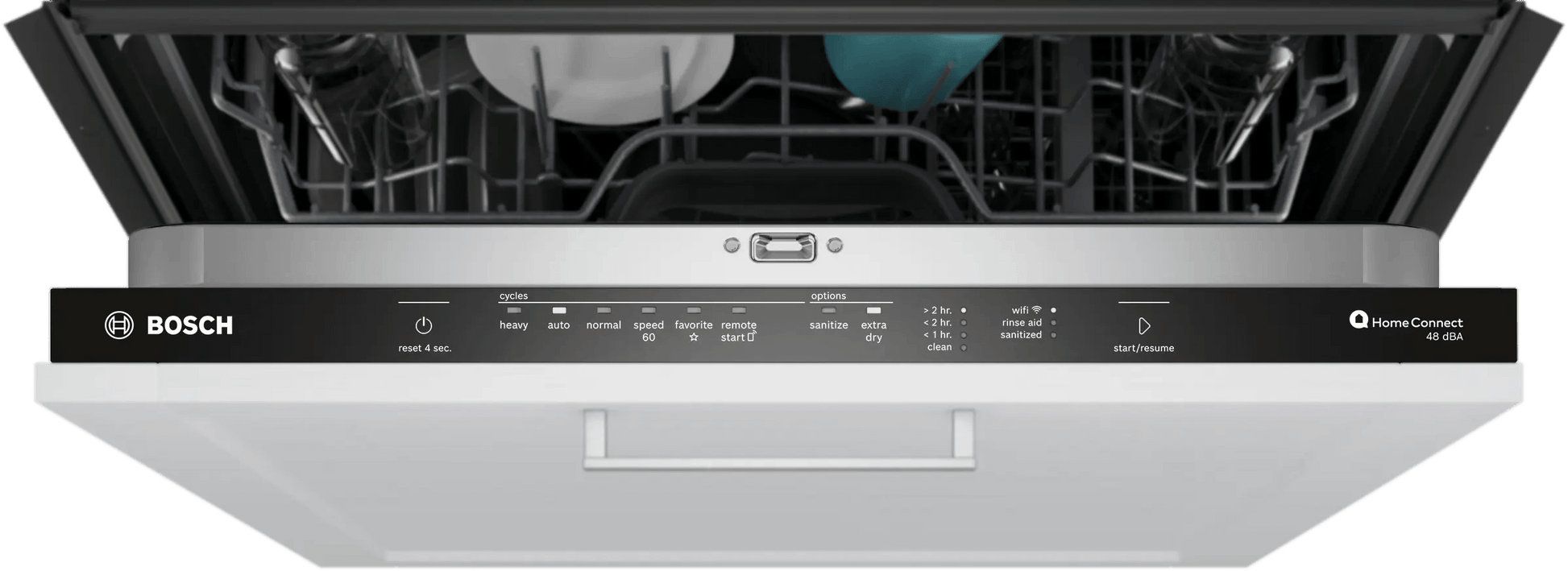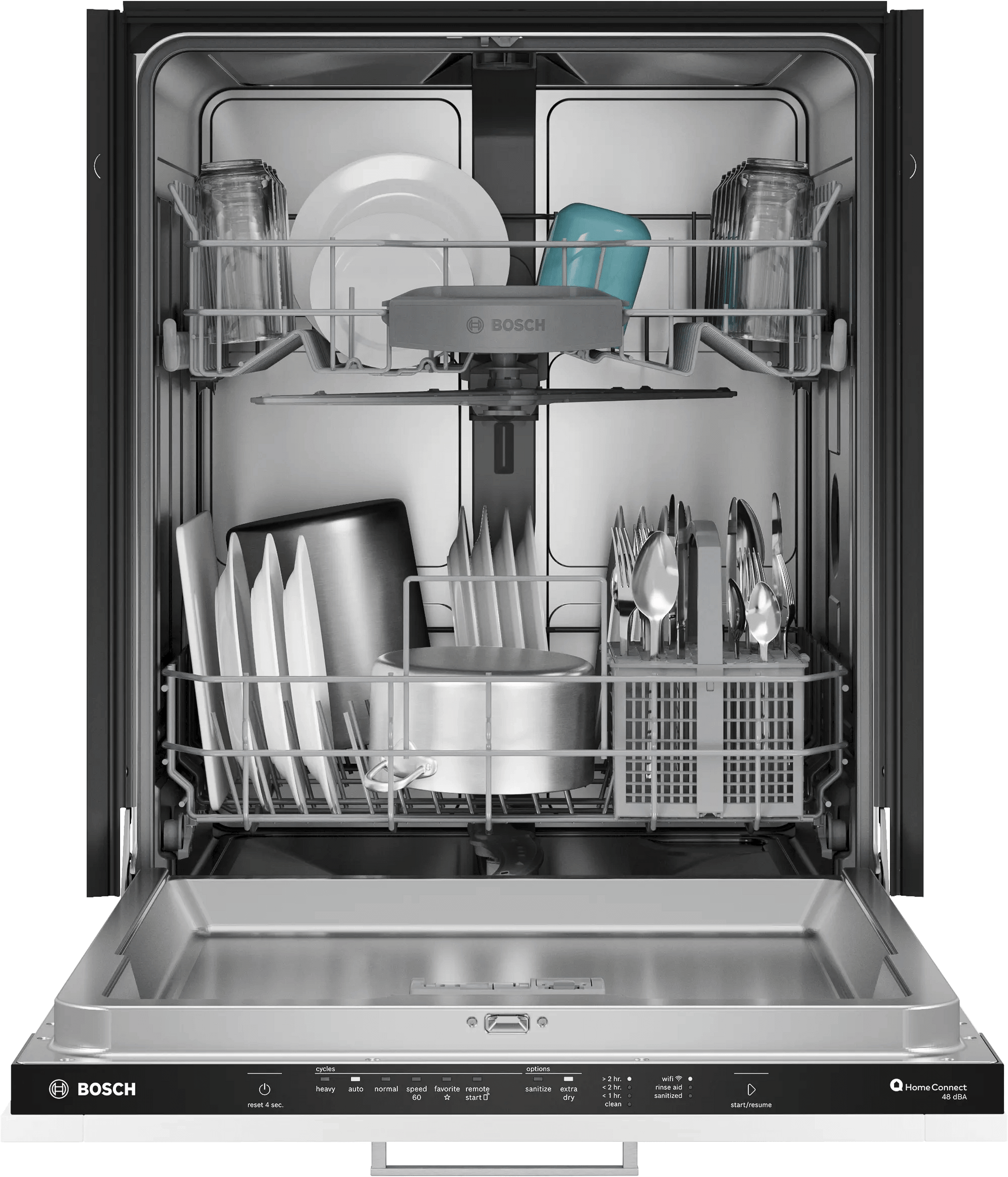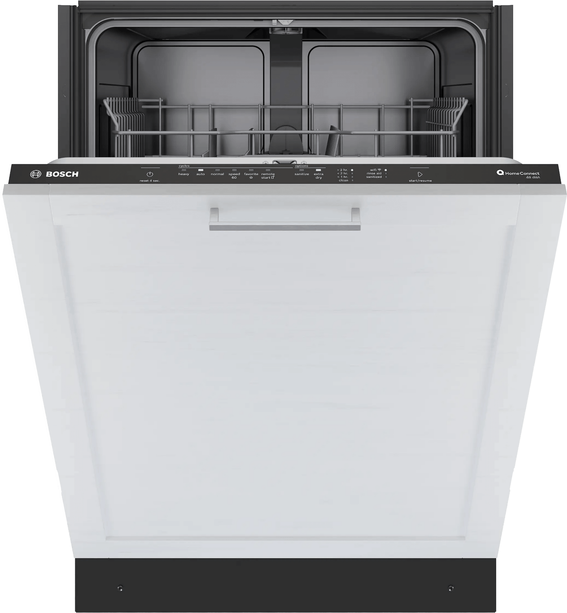 Bosch 100 Series dishwashers deliver a clean and dry you can rely on, plus extra flexibility when you need it. The redesigned, edge-to-edge recessed handle with integrated front controls blend functionality and beauty. With PrecisionWash, intelligent sensors continually scan and check the progress of dishes throughout the cycle, while powerful spray arms target every item of every load, for a smarter clean. PureDry technology delivers simply clean, simply dry dishes with an energy efficient, closed drying system. Get personalized app features like Smart Cycle, hands-free voice control with Amazon Alexa or Google Home and so much more, all when you use Wi-Fi enabled Home Connect.