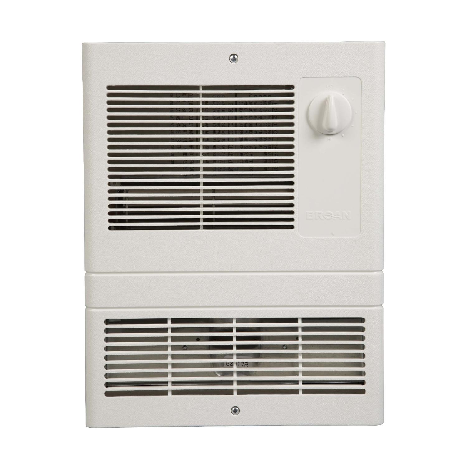 The Broan 10-1/2 in. x 12-1/2 in. 1,500-Watt White Fan-Forced Wall Heater is a large-capacity unit ideal for high heat-loss areas like lobbies, entrance ways and vestibules. This wall heater features a built-in, adjustable thermostat to help you control the temperature of a specific area. This wall heater wires easily to accommodate installation for 120 or 240-volt applications.