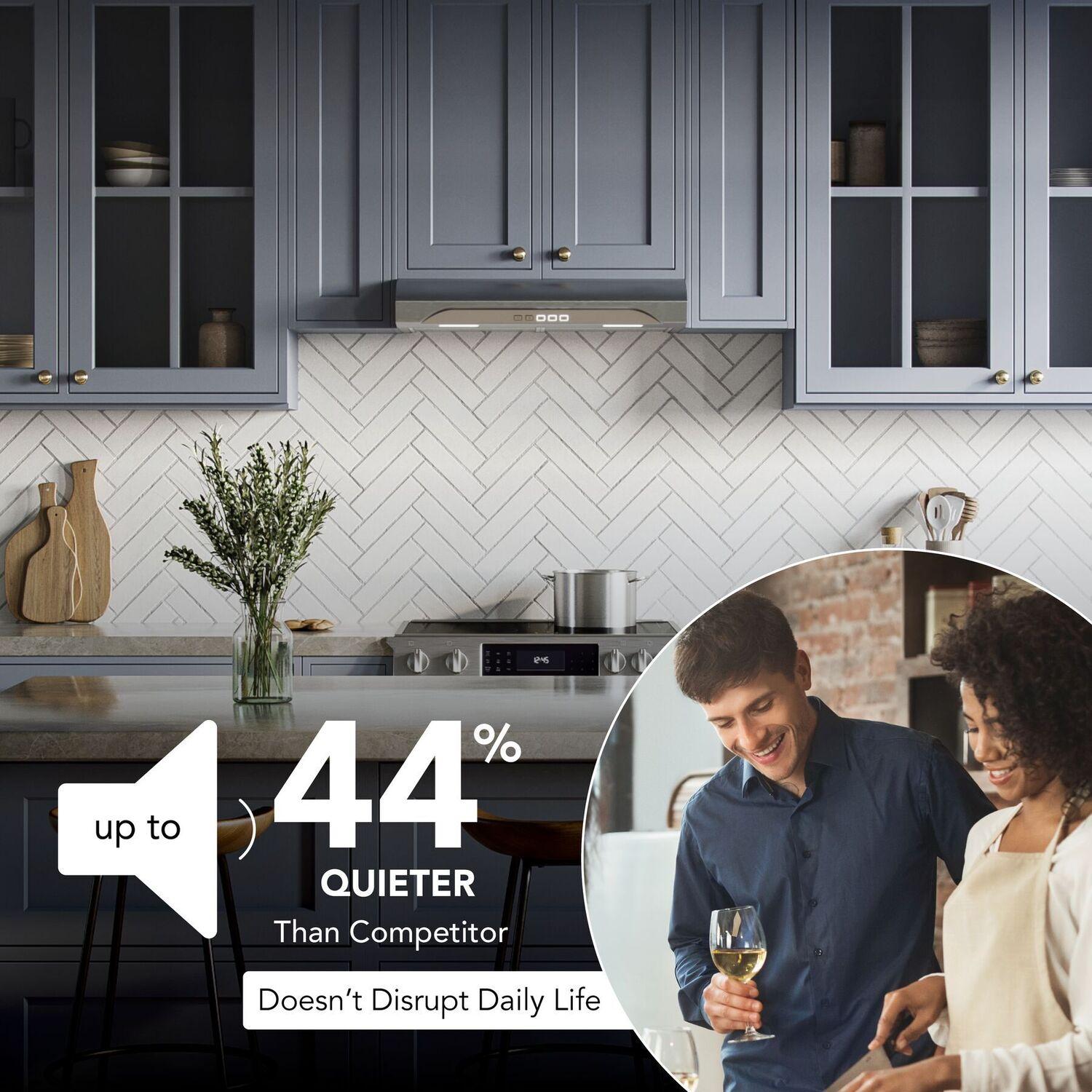 - Up to 44% Quieter: With sound equivalent to a a refrigerator running, this vent hood is up to 44% quieter than competition at 1.5 sones on working speed