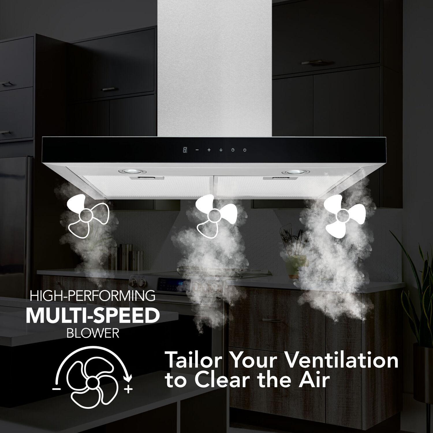 From the leader in residential indoor air quality, this Broan® T-style range hood is the perfect solution for today's modern kitchen - featuring a smooth, easy to clean stainless steel finish with sleek black glass, 5-minute delay off timer, and quick-release dishwasher safe hybrid baffle filters. The kitchen is the most polluted room in the house regardless of type of cooking appliance; everything from smoke, odors and chemicals is in the air. The range hood is often forgotten as the primary and most effective way to get the pollutants out of your home. This range hood is HVI certified - guaranteed to provide efficient ventilation with 450 Max Blower CFM to remove the pollutants and improve the air you breathe. While ventilating the kitchen air, this range hood is still quiet at a sound level of 3 sones on normal speed, which is as loud as normal conversation. The bright 1-level, heat resistant LED lighting illuminates the cooktop and the telescopic flue accommodates 8 to 9 foot ceilings. At Broan-NuTone we believe that better quality of air means better quality of life.