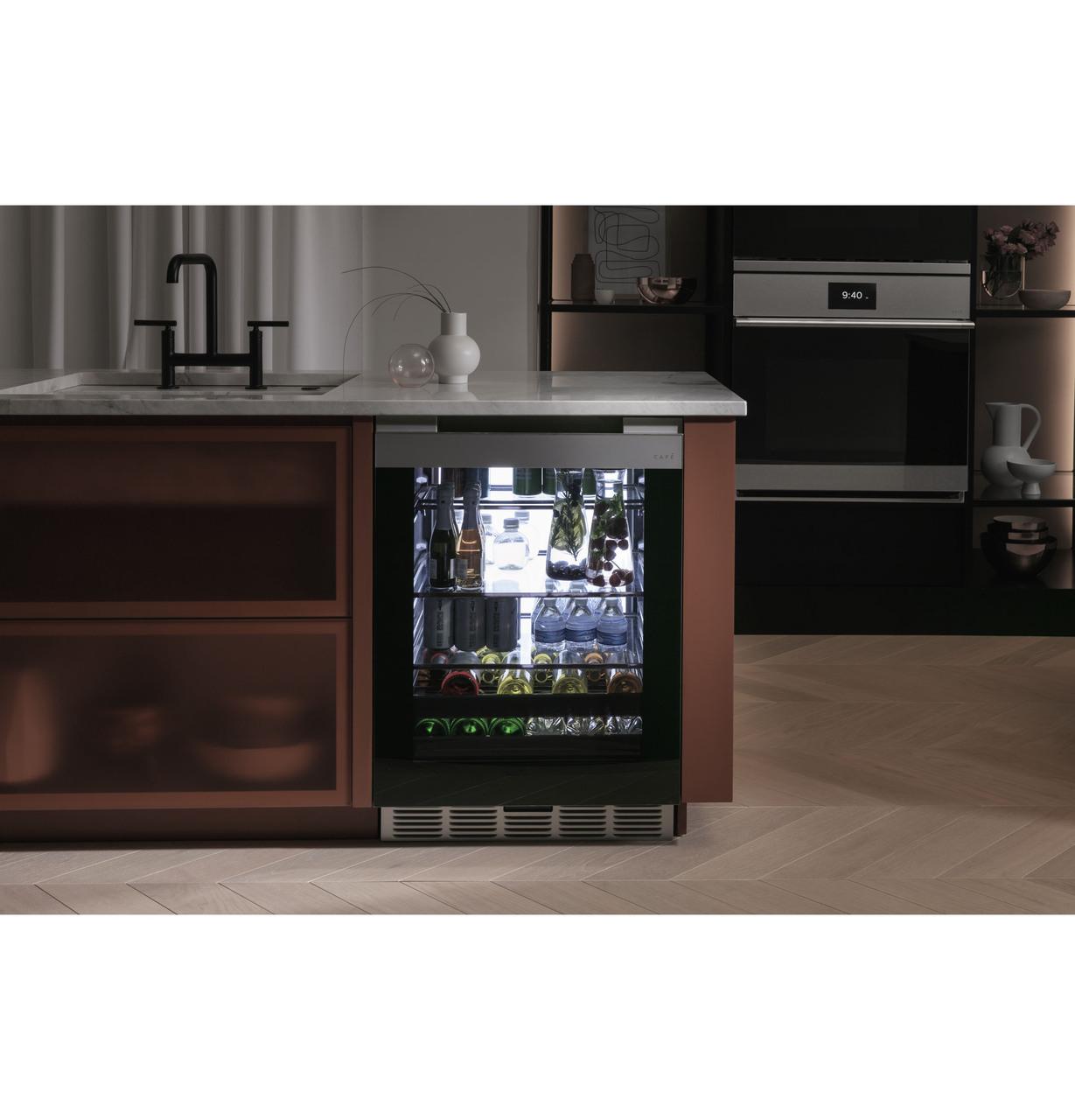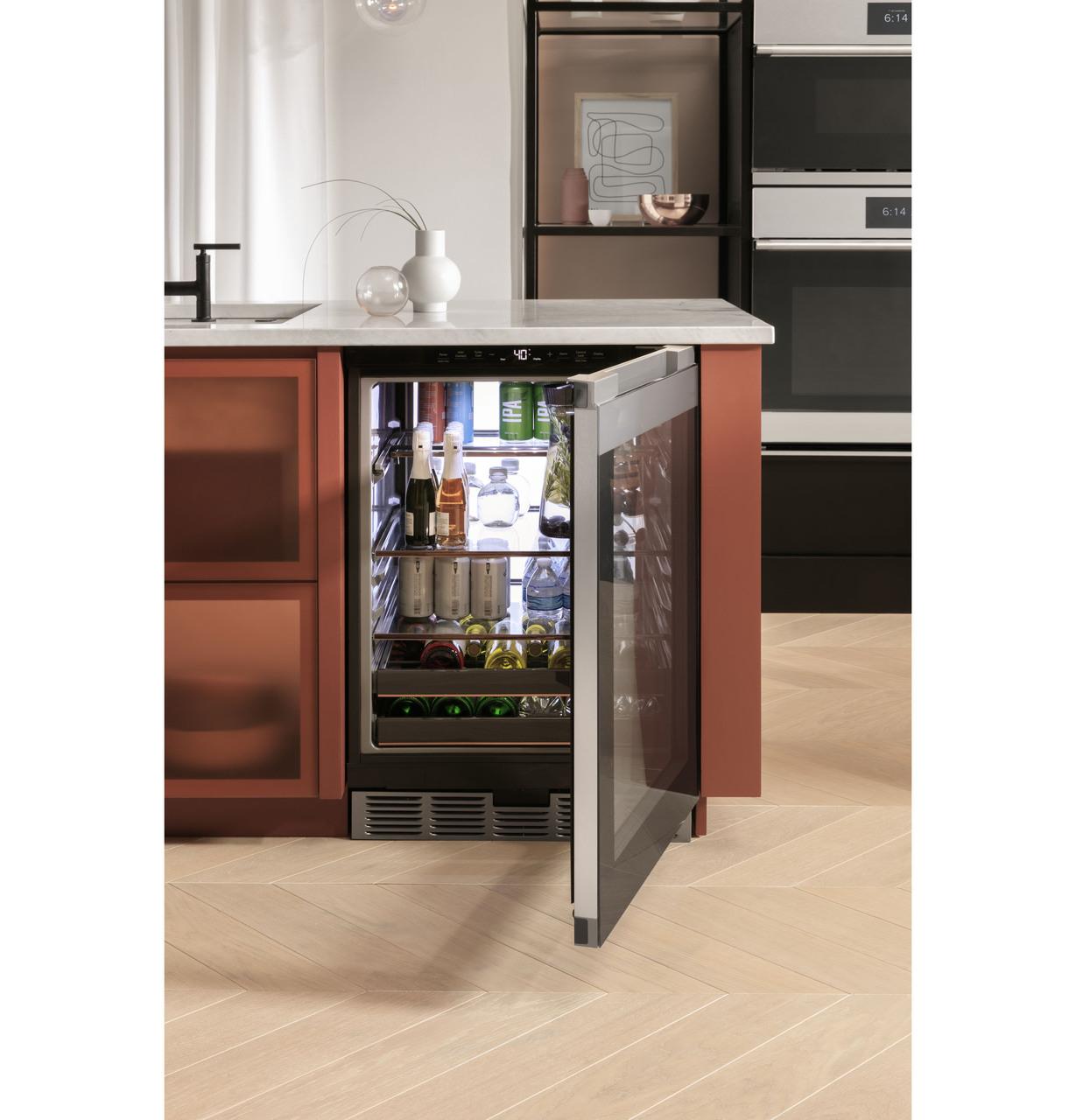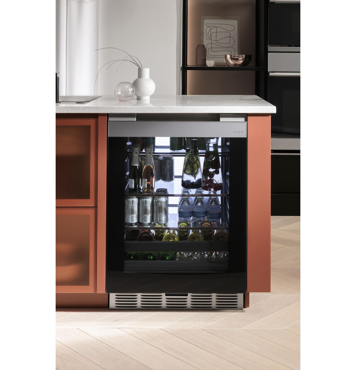 This beverage center has an attractive, easy-to-clean glass finish that will create a contemporary look in your kitchen