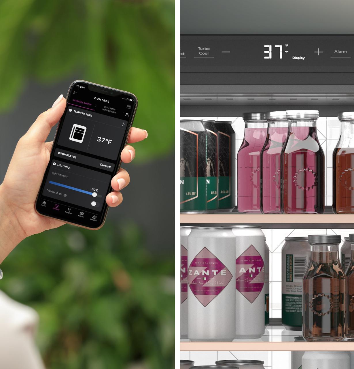 The beverage center has Built-In WiFi so you can control it from anywhere. Using the SmartHQ app, you can remotely change your temperature or dim the LED light wall. Plus, you'll get the latest connected home capabilities with new modes and updates