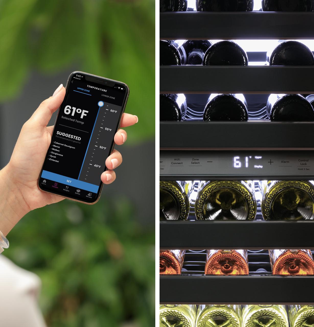 Keep wine at the perfect serving temperature, so you re always prepared to entertain guests. On the outside, this Dual Zone wine chiller features a stunningly modern Platinum Glass finish, which is as easy to clean as it is beautiful. On the inside, a LED light wall spans the back panel, filling the interior with bright light so every item is easy to find. The capacity is large enough for 46 bottles, with magnum bottle storage that accommodates up to eight 1.5 liter bottles of wine without scratching the label or sacrificing space on other shelves. Built-in WiFi allows you to control the unit remotely, too-all on the SmartHQ app.
