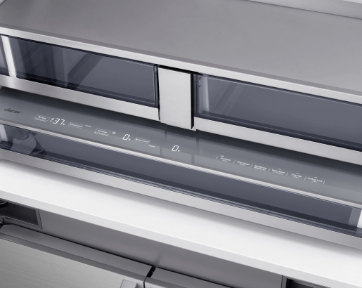 | INTERIOR CONFIGURATION | Full Width Shelves - Refrigerator : 1 ea. Adjustable Shelves - Refrigerator : 4 ea. Shelf Material - Refrigerator : Tempered Glass Shelves w/Metal Trim Full Extension Drawers at 90° Door Opening Angle : Yes FreshZone Drawer : Yes - Cheese (37°F) / ColdDrinks (33°F) / Mea.t (29°F) Crisper Drawers : 2 ea. Door Bins -Refrigerator : 6 ea. Freezer Drawers : 4 ea. |