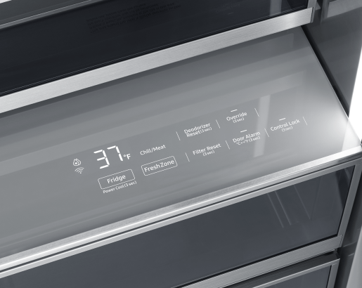| INTERIOR CONFIGURATION | Full Width Shelves : 4 ea. Shelf Material : Tempered Glass, Metal Trim, Spill-Proof Full Extension Drawers at 90° Door Opening Angle : Yes FreshZone Drawer : Yes - Cheese (37°F) / ColdDrinks (33°F) / Mea.t (29°F) Humidity Control Drawer : 2 ea. Door Bins : 4 ea. |