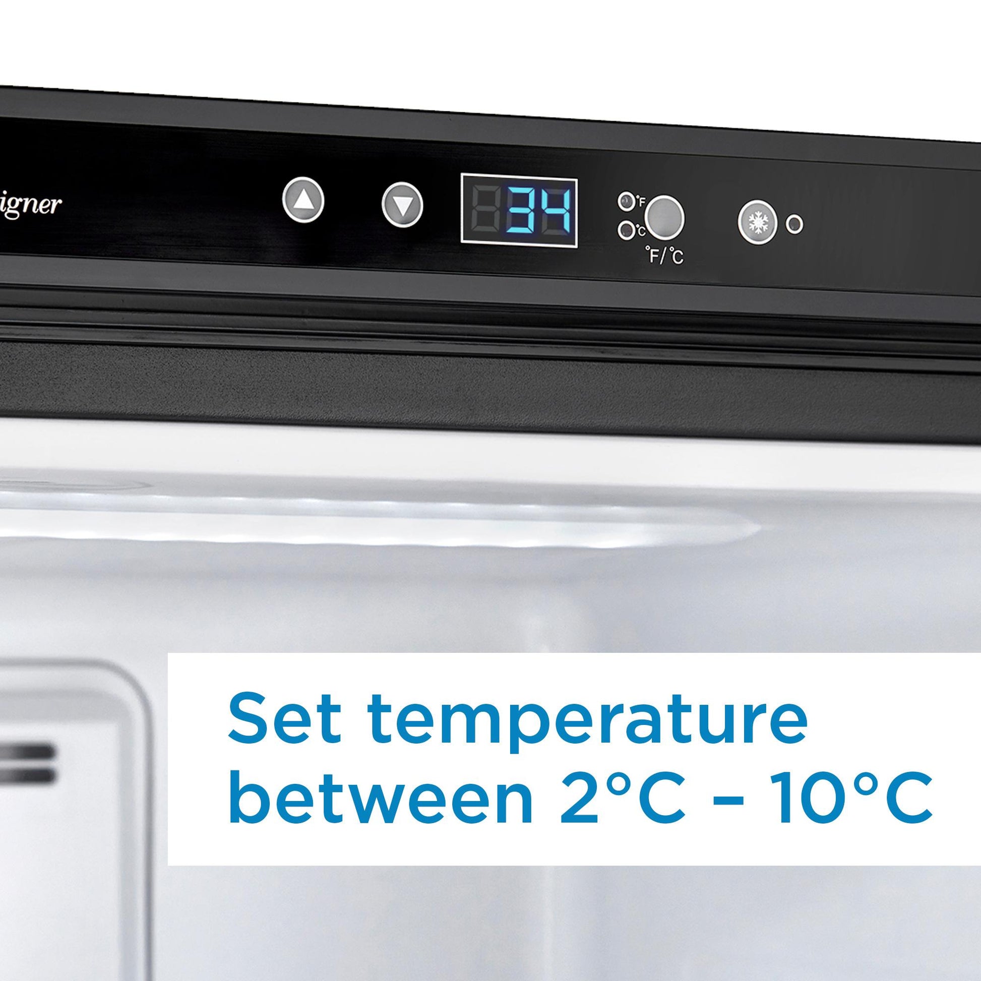 - A precise digital thermostat with a blue LED display can be set between 36F - 50F (2C - 10C)