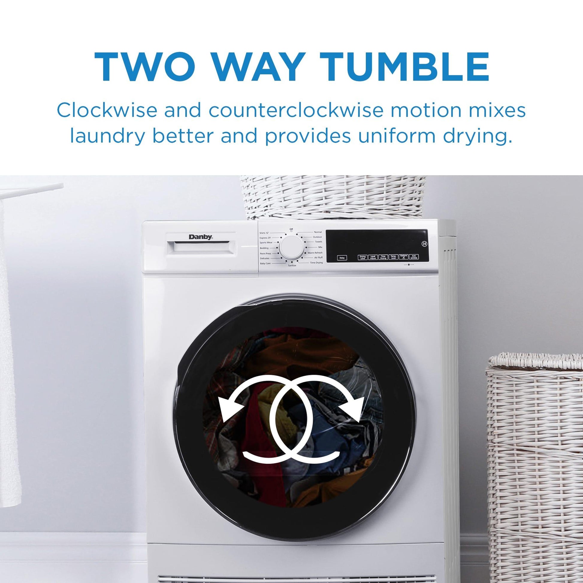 - Two Way Tumble: Clockwise and counterclockwise motion mixes laundry better and provides uniform drying