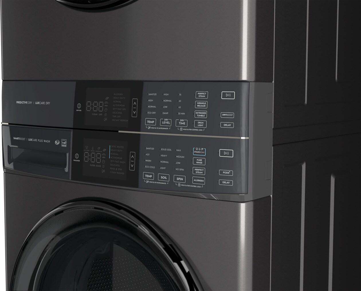 Full-size and fully integrated front load electric Electrolux Laundry Tower features a stacked design that takes up half the floor space, freeing up the laundry room for extra storage, all with an easy to reach control panel. The washer provides the most effective stain removal with SmartBoost® premixing technology* and the dryer with LuxCare® Dry uses an moisture sensor to prevent over or under-drying.