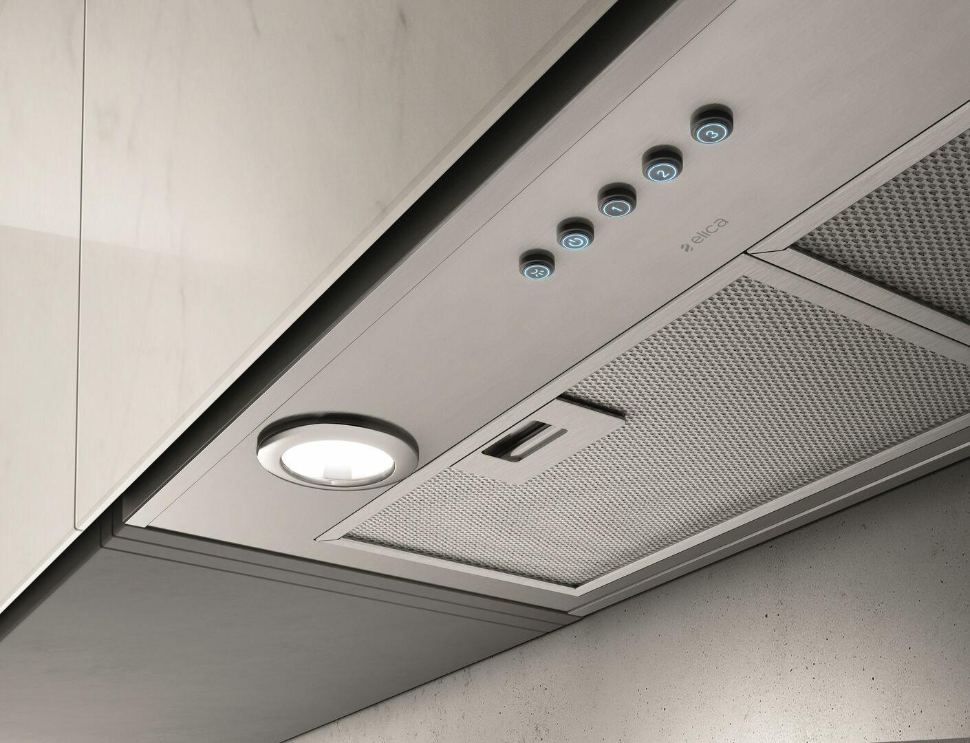 Asti is designed for discreet mounting inside cabinetry, fits perfectly into 12 deep cabinetry, and is ideal for kitchens where space is limited, or the range hood needs to be out of sight. Asti comes equipped with a powerful 400 CFM blower that can handle most cooking needs. Convenient Backlit Electronic Push Button Controls operate the 3-speed blower and LED lighting, while dishwasher-safe anodized aluminum mesh filters o er easy maintenance. Asti is designed for standard ducted or recirculating installation.
