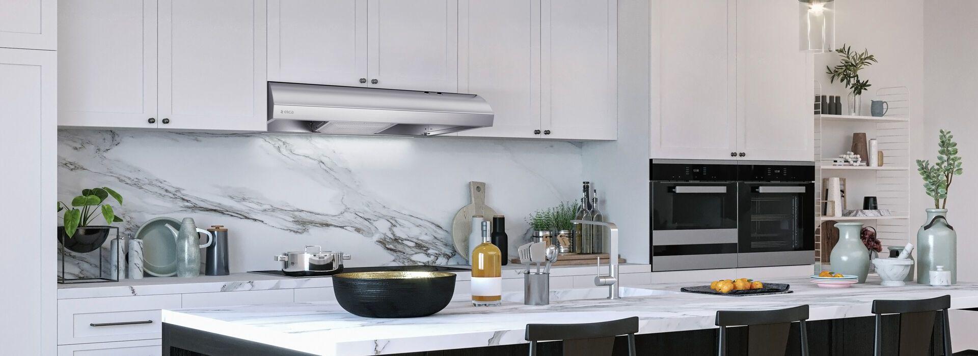 Fusaro has a slender 5 height and soft curves, designed to modernize and perfectly fit kitchens where space is premium. A 2-speed, 190 CFM internal blower provides sufficient ventilating power for most kitchens. Color-coordinated rocker switches control blower speeds and 75W incandescent lightning. The anodized aluminum mesh grease filter is dishwasher-safe and simple to remove and re-install. With a 2 in 1 grease and carbon filter, Fusaro is designed for standard ducted or recirculating installations.