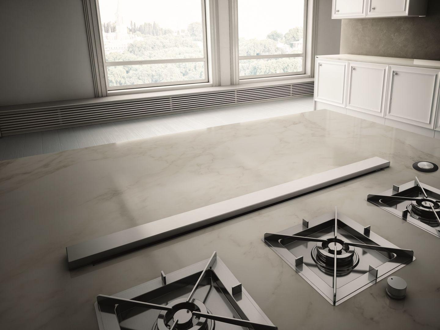 When the view out your kitchen window is too spectacular to disrupt with a range hood, Elica s Rise is the perfect solution. Rise recesses completely out of sight into the countertop when not in use, but when it s time to cook, it elevates a full 14 above the countertop-almost twice the height of competitors-for added ventilating efficiency. Additionally, Elica's Perimeter Aspiration Technology increases suction by 35%, effectively drawing air from the front burner to create the best functioning downdraft on the market. Rise comes equipped with a powerful 600 CFM internal blower, operated by an electronic rotating control mounted into the countertop or cabinet face. For maximum flexibility, the blower can be rotated to the opposite side to make room for a floor-mounted range.