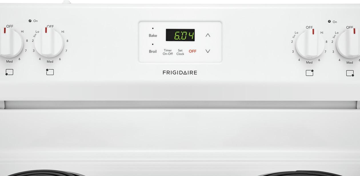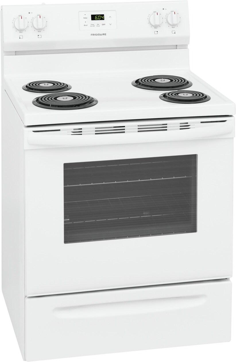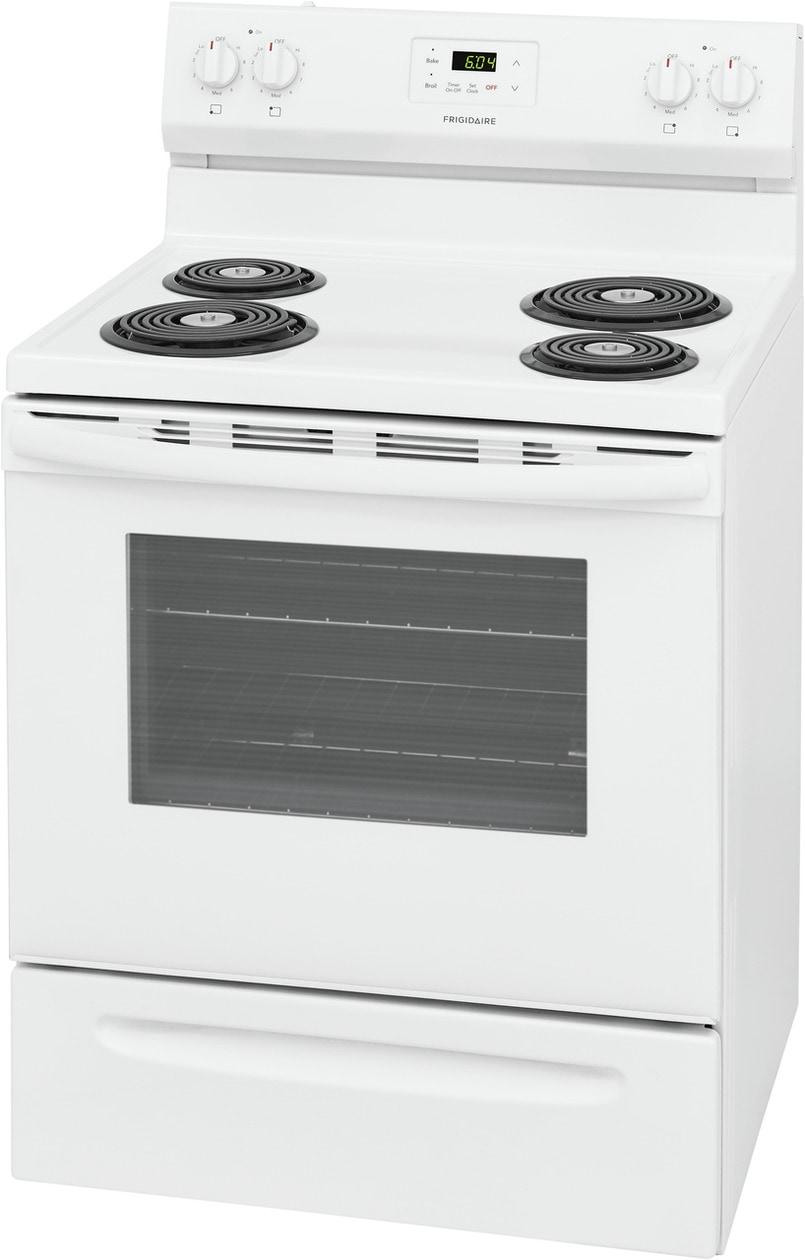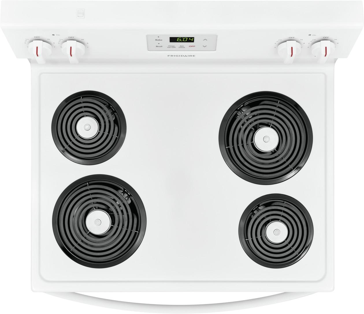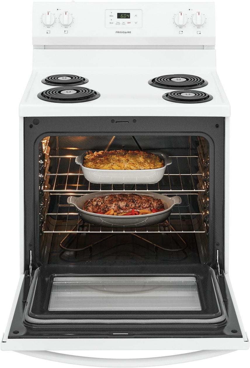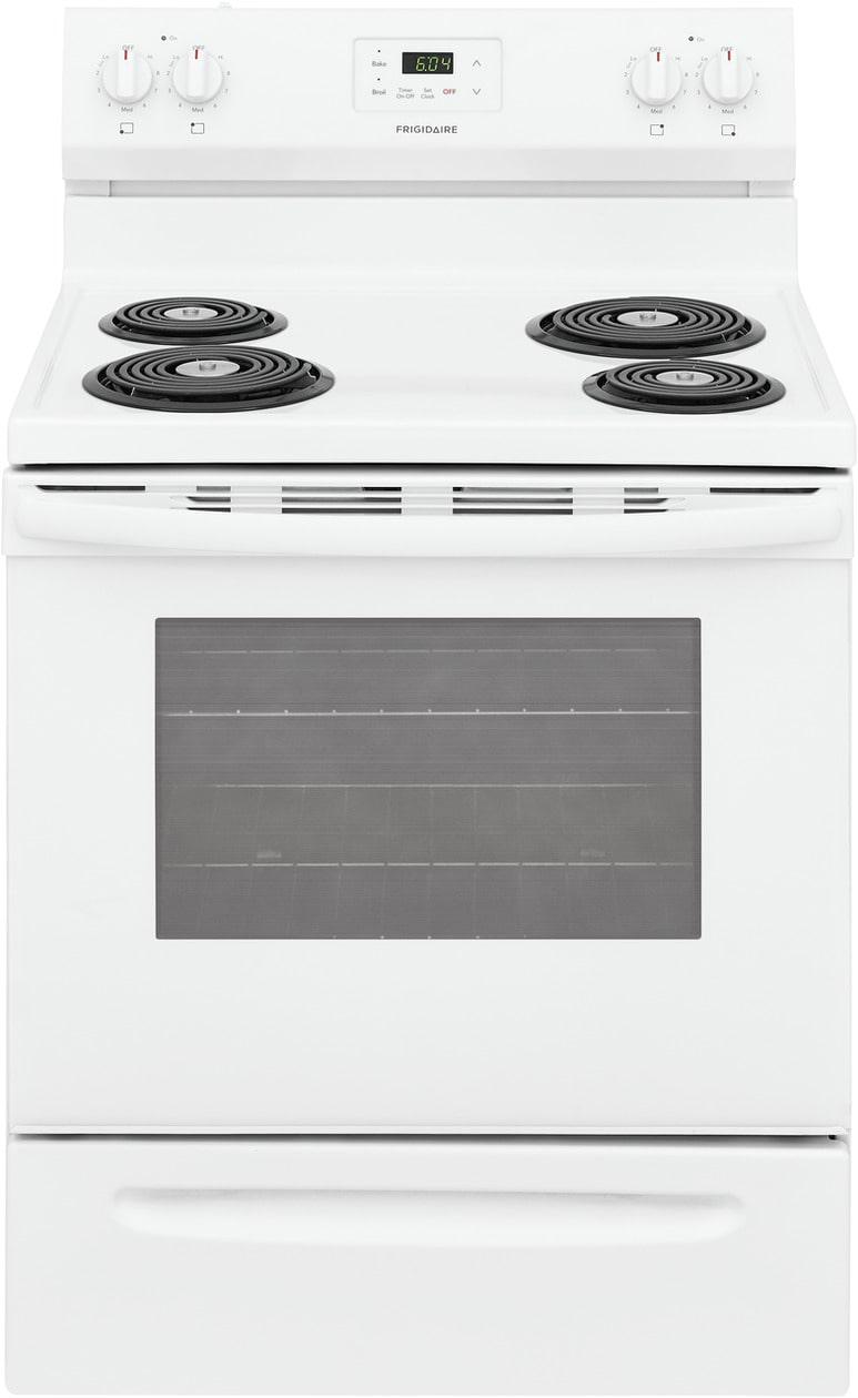 The Frigidaire 30 in. Freestanding Electric Range offers a 5.3 cu. ft. capacity oven and a 4-element electric cooktop featuring two 8 in. and two 6 in. coil elements, so you can cook more at once. Designed for safety, the cooktop includes indicator lights that let you know when it's still hot, while the large oven window allows you to easily monitor food as it bakes.