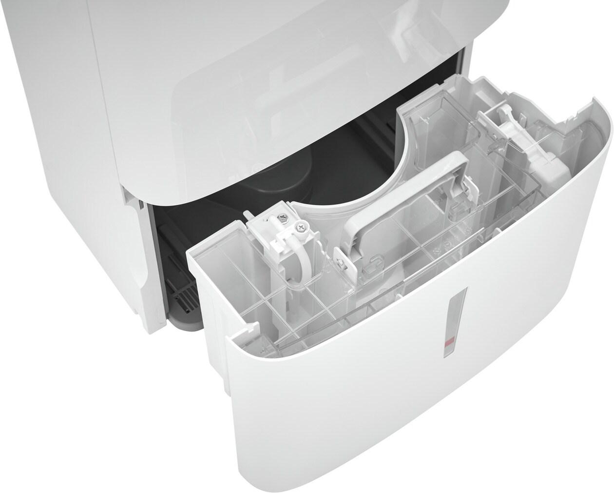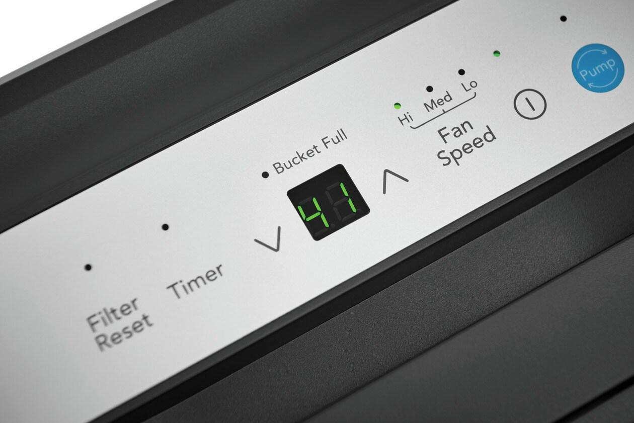 The Frigidaire 50 Pint Dehumidifier with Built-In Pump saves you time and energy normally spent manually emptying a water bucket by allowing the unit to discharge moisture in an upward direction, either into a sink or out of a window. The Easy-to-Clean Washable Filter captures dust from the air for a cleaner, more comfortable home environment with Custom Humidity Control for maximized comfort. Front loading bucket with carrying handle and splash guard makes cleaning hassle-free.