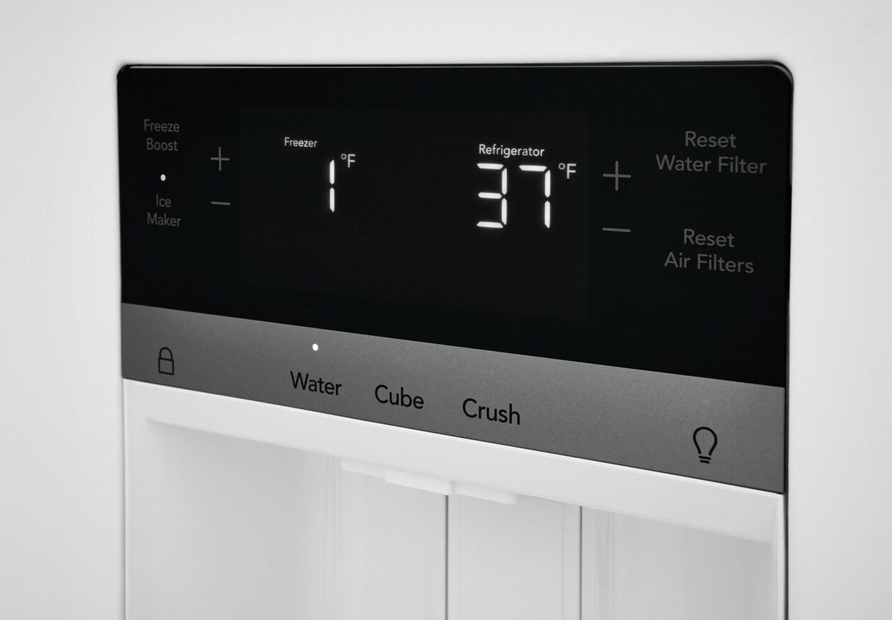 This Frigidaire French door refrigerator helps keep fruits and vegetables fresh longer with CrispSeal® crispers which blocks dry air from entering your crisper. Easily stay organized with a full width deli drawer & Large door bin storage.