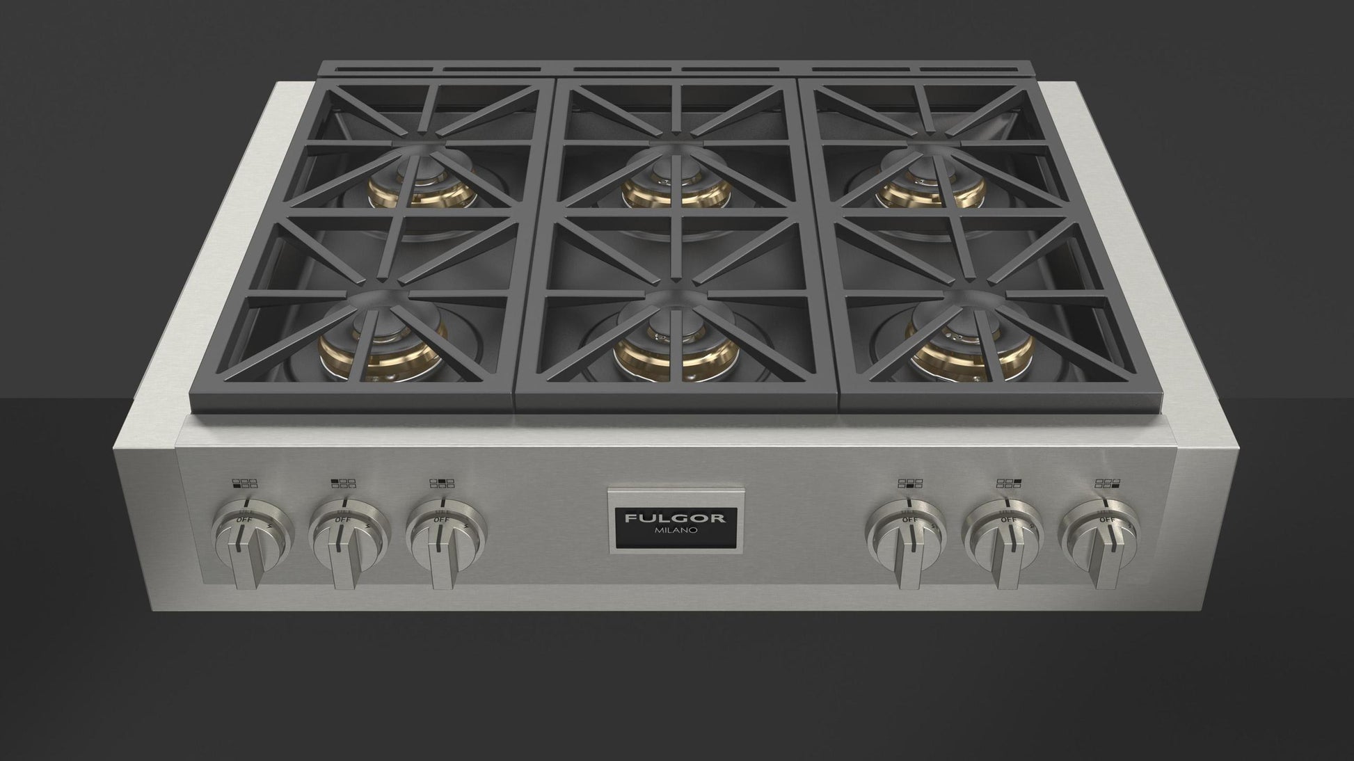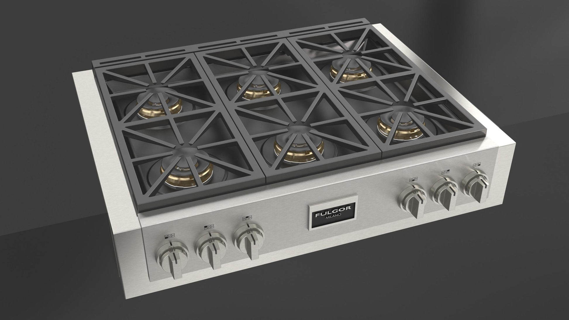 Style and performance are the most appropriate description for the Professional Range Top. The combination of solid material and efficient technology allows us to offer versatile and functional solutions. The sturdiness of the stainless steel structure combined with the heavy duty continuous grates; the steel knobs with power modulation from maximum to that for simmer cooking on the Crescendo gas burners, offer infinite possibilities to cook recipes like a chef.