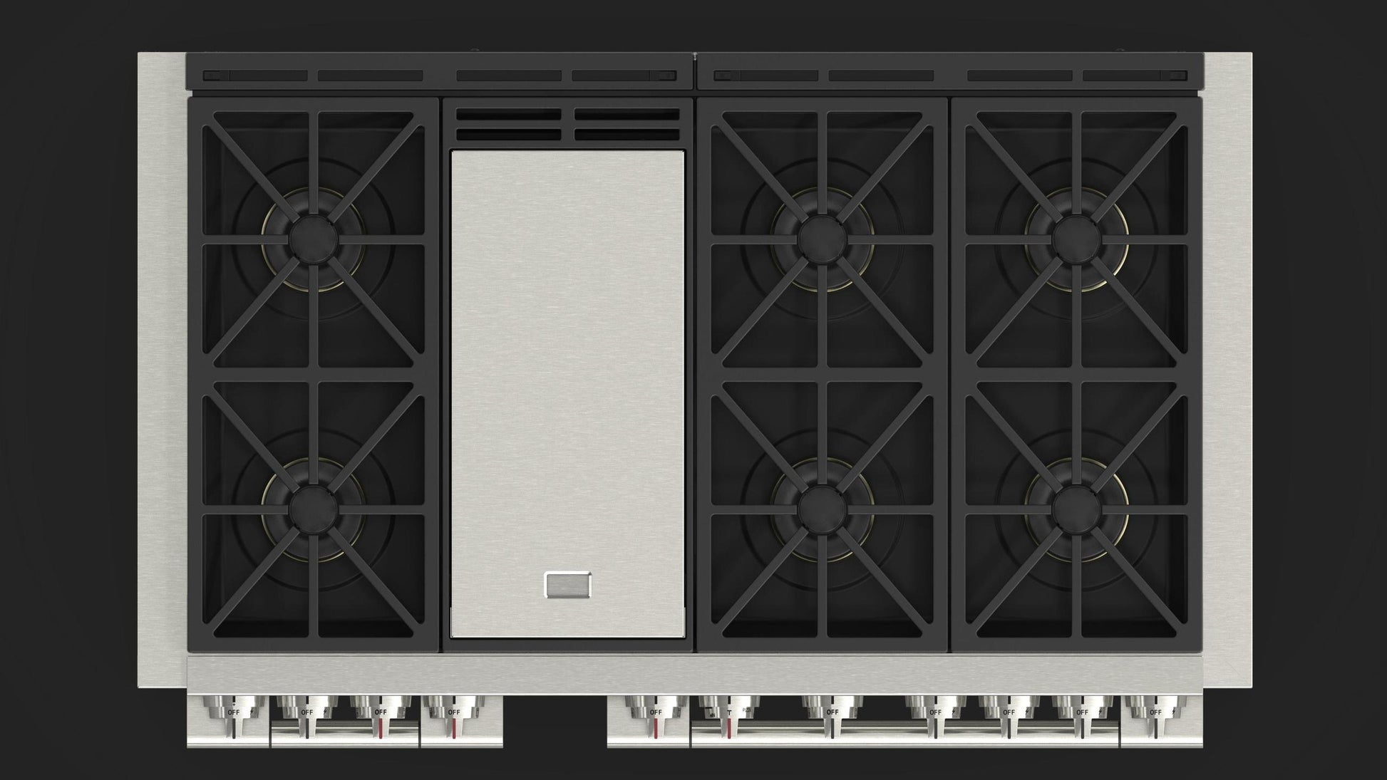 Featuring a thoughtfully designed cooking surface with 6 burner positions, each with a 5 in 1 Crescendo burner. Heavy-duty cast-iron grates form a continuous surface for easy movement of pots and pans.