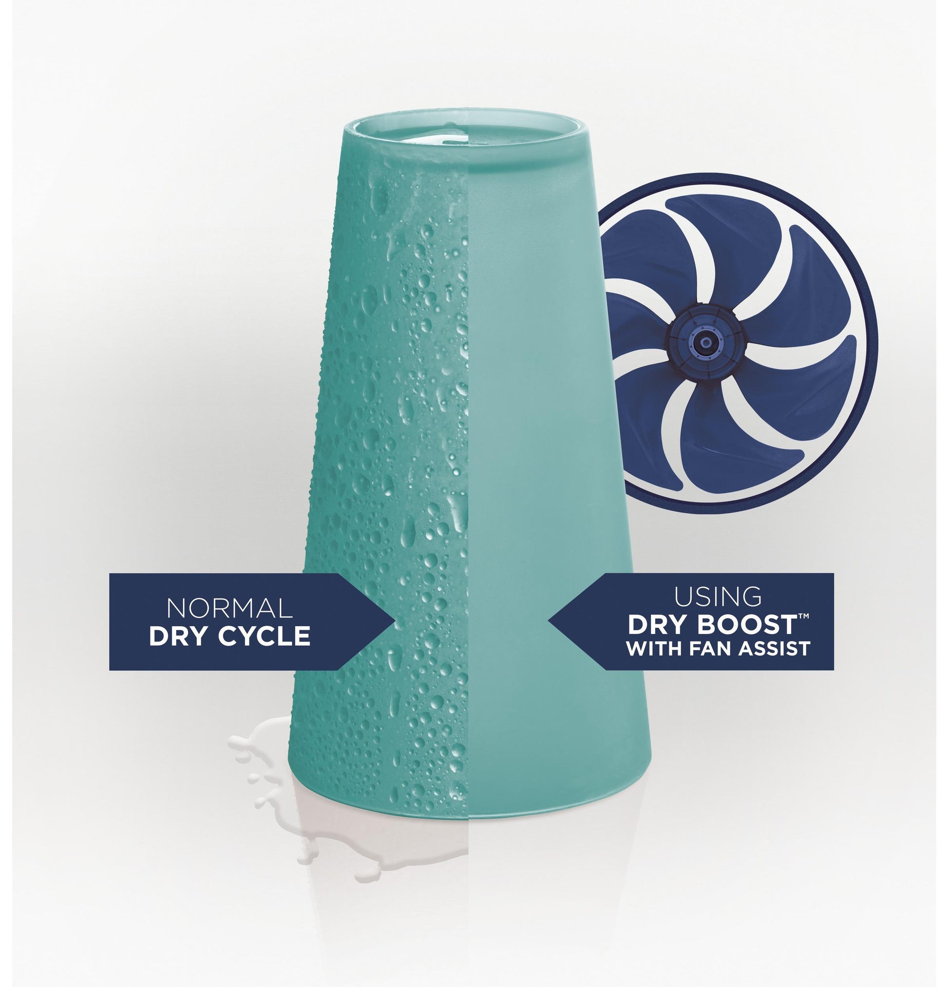 Dry Boost with Fan Assist gets hard-to-dry items like plastics up to 3 times drier than heated dry cycles using a fan that pulls moist air out, resulting in table ready dishes