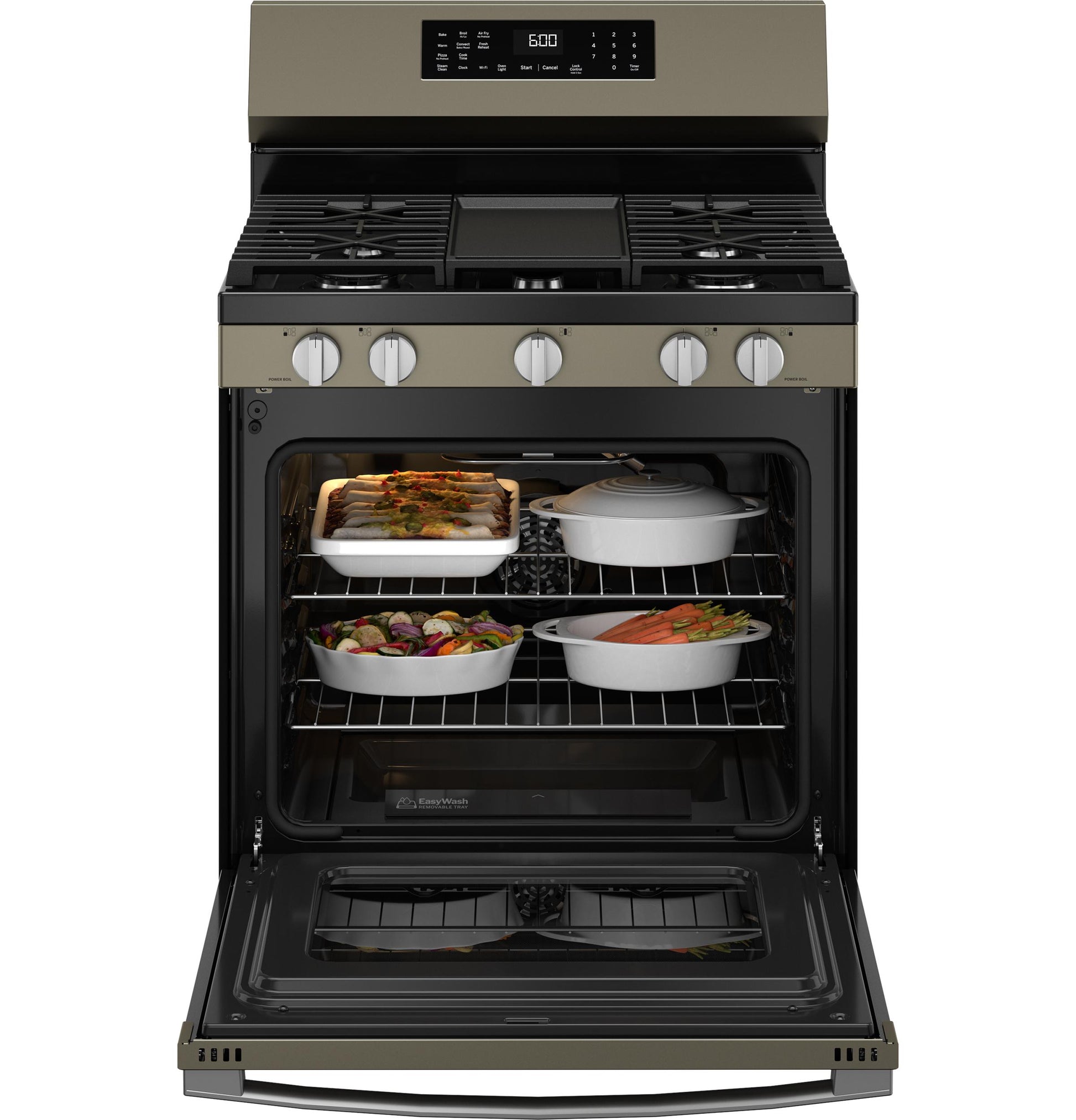 Oven cleaning is easier than ever with the EasyWash™ Oven Tray. This enameled tray is easily removed and rinsed clean in the sink or, for bigger messes, guaranteed to fit in all GE Appliances dishwashers.