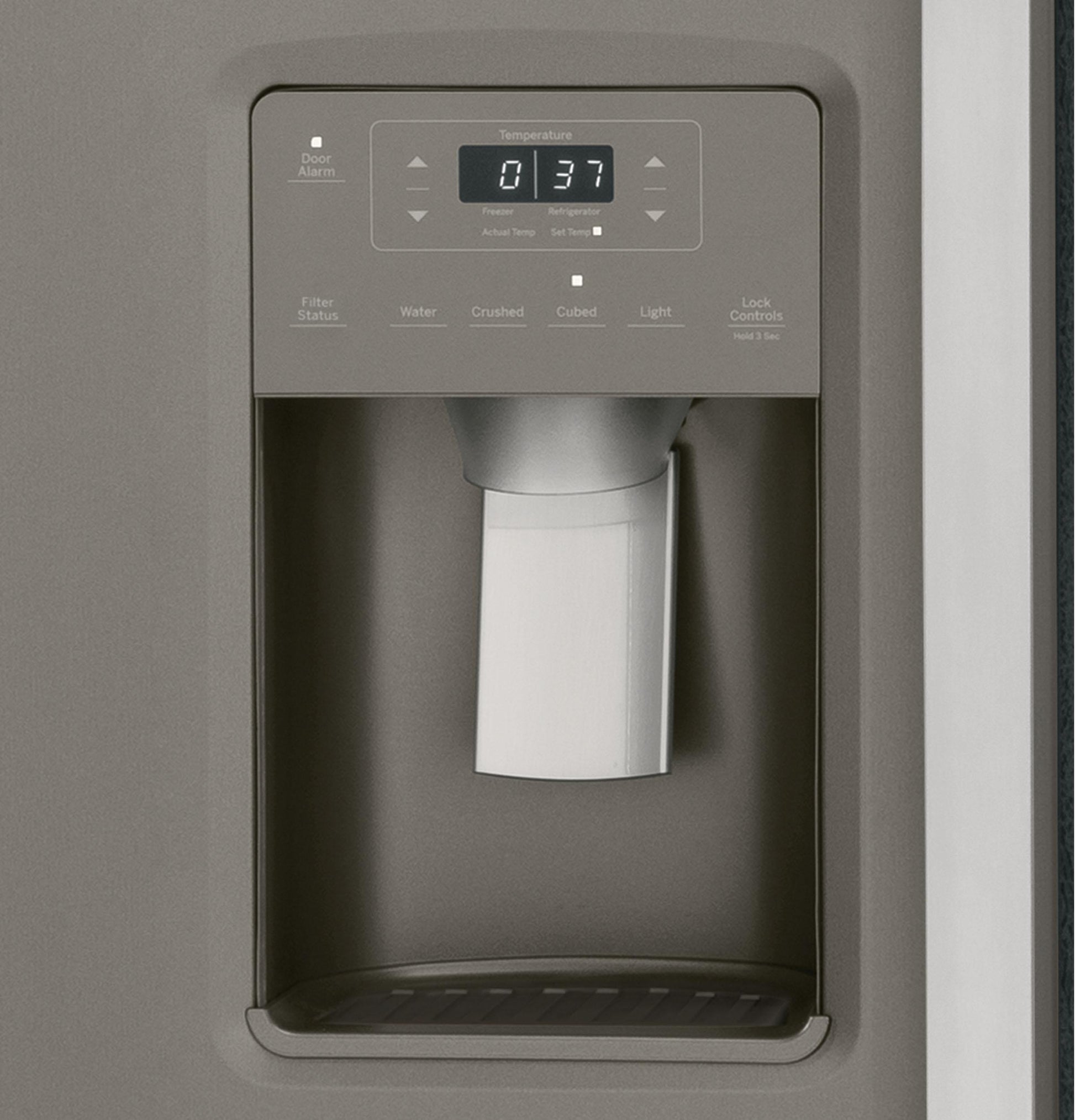 Easily access clean water and filtered ice from a dispenser conveniently located on the outside of the door