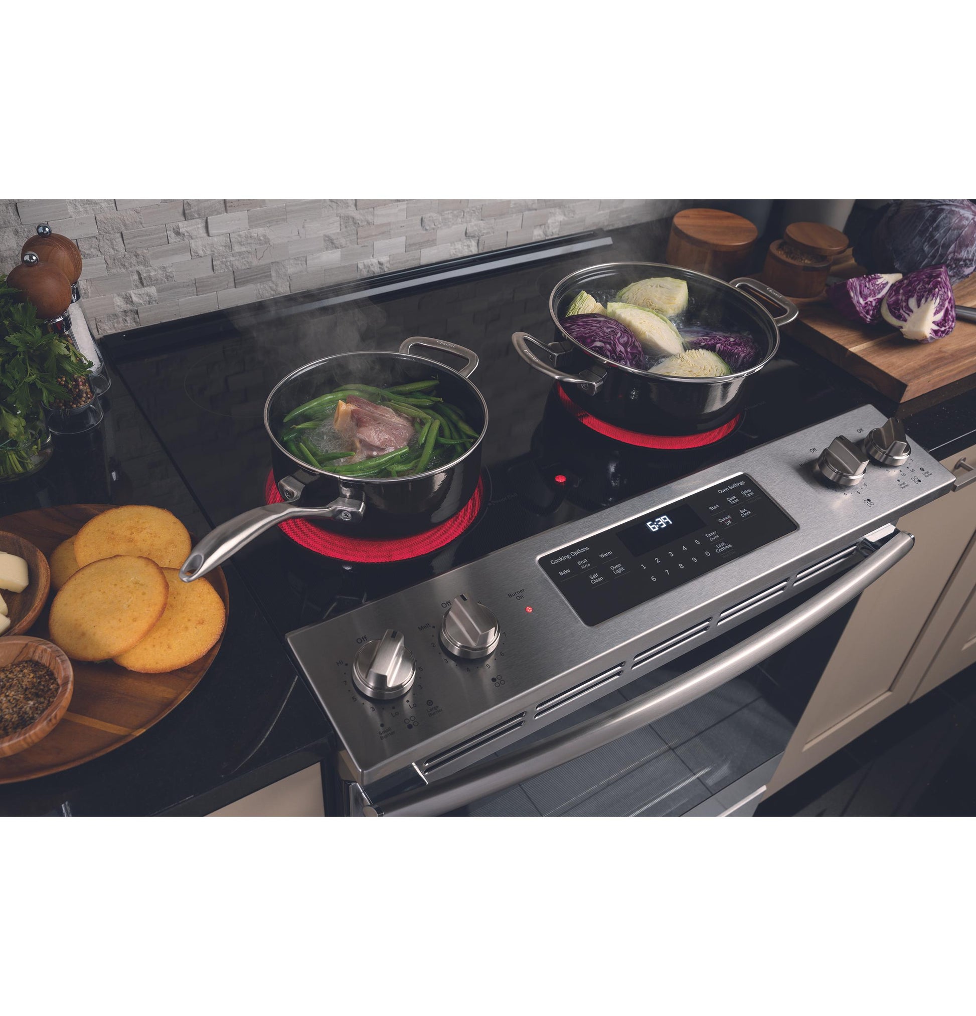 Two powerful elements boil water 25% faster than standard GE elements and adjust to fit cookware