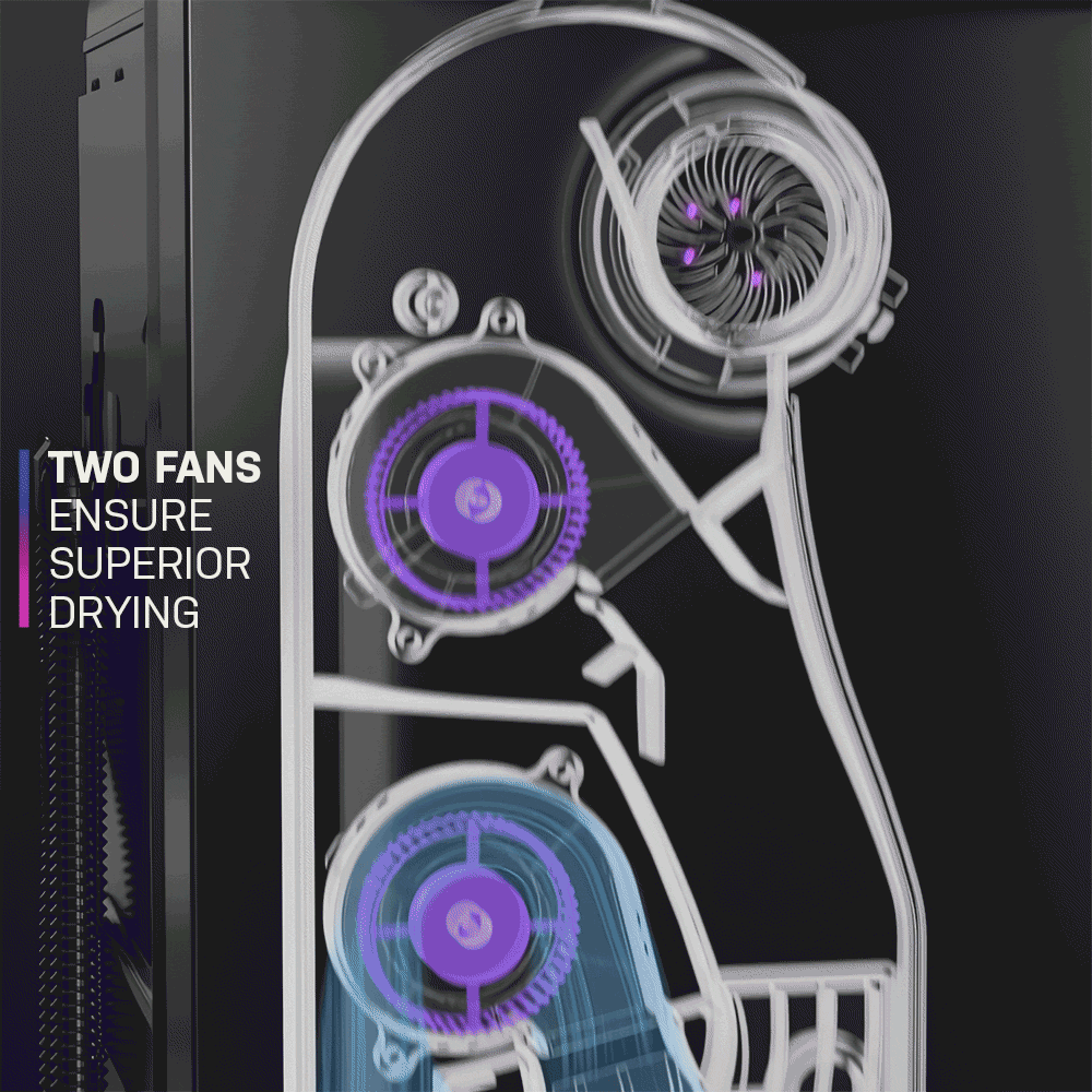The Twin Turbo Dry Boost™ system uses a smart dual wattage heater and 2 fans that work together to remove water from hard-to-dry items like plastics and sports bottles.