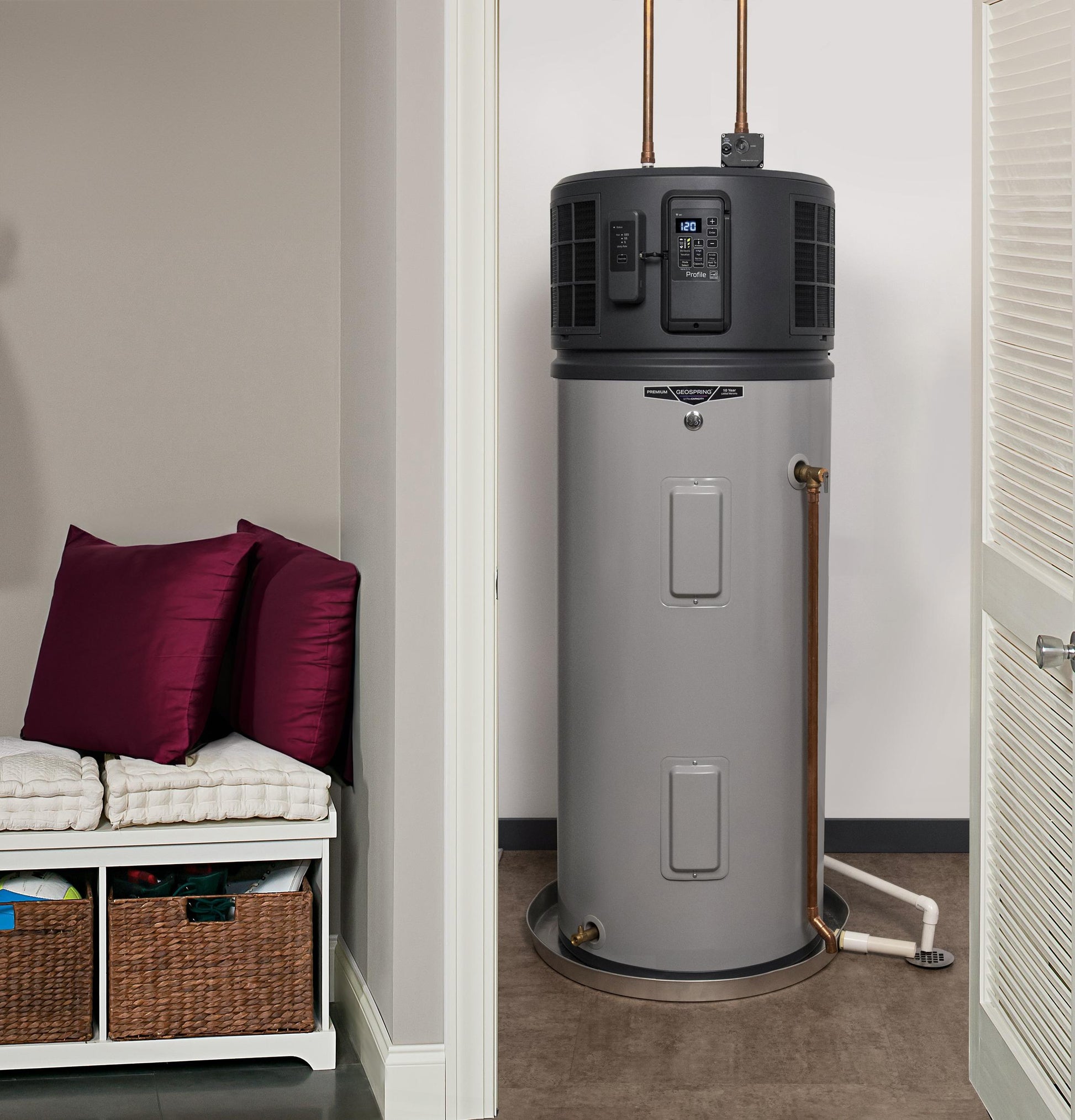 Adapts to your home. GEOSPRING™ heat pump water heaters feature a variable speed compressor that adjusts speed based on environmental conditions. Enjoy consistent hot water, even in colder climates, with enhanced energy efficiency.