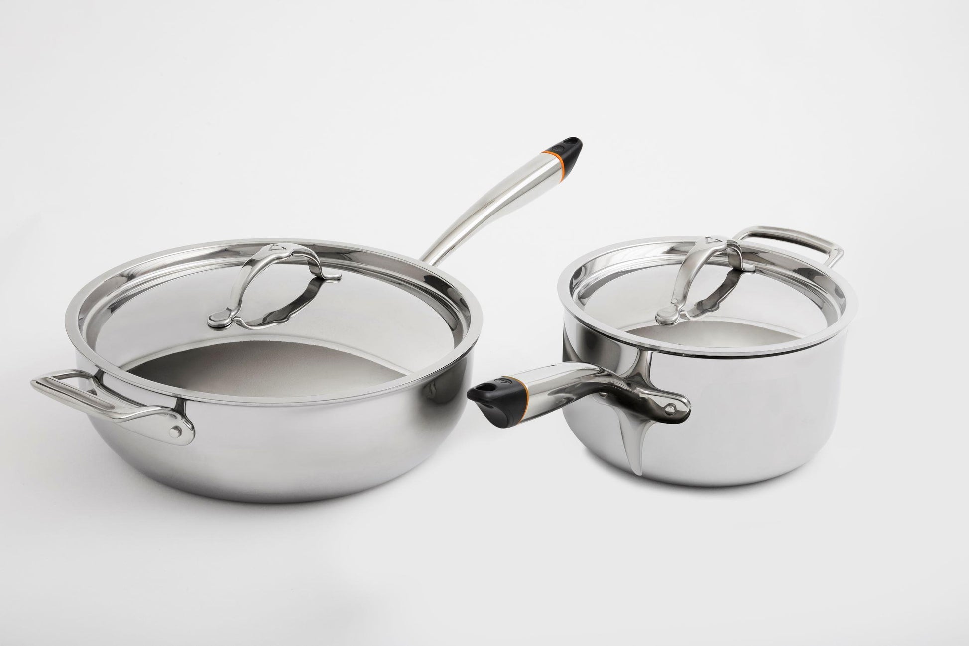 A Smart Cookware set includes a 5.5 quart sauce pot with lid and 3.5 quart sauce pot with lid. Built-in thermocouple lets you maintain precise temperatures on certain Monogram, Caf(eback) and GE Profile ranges and cooktops. Tri-ply stainless steel works on induction.