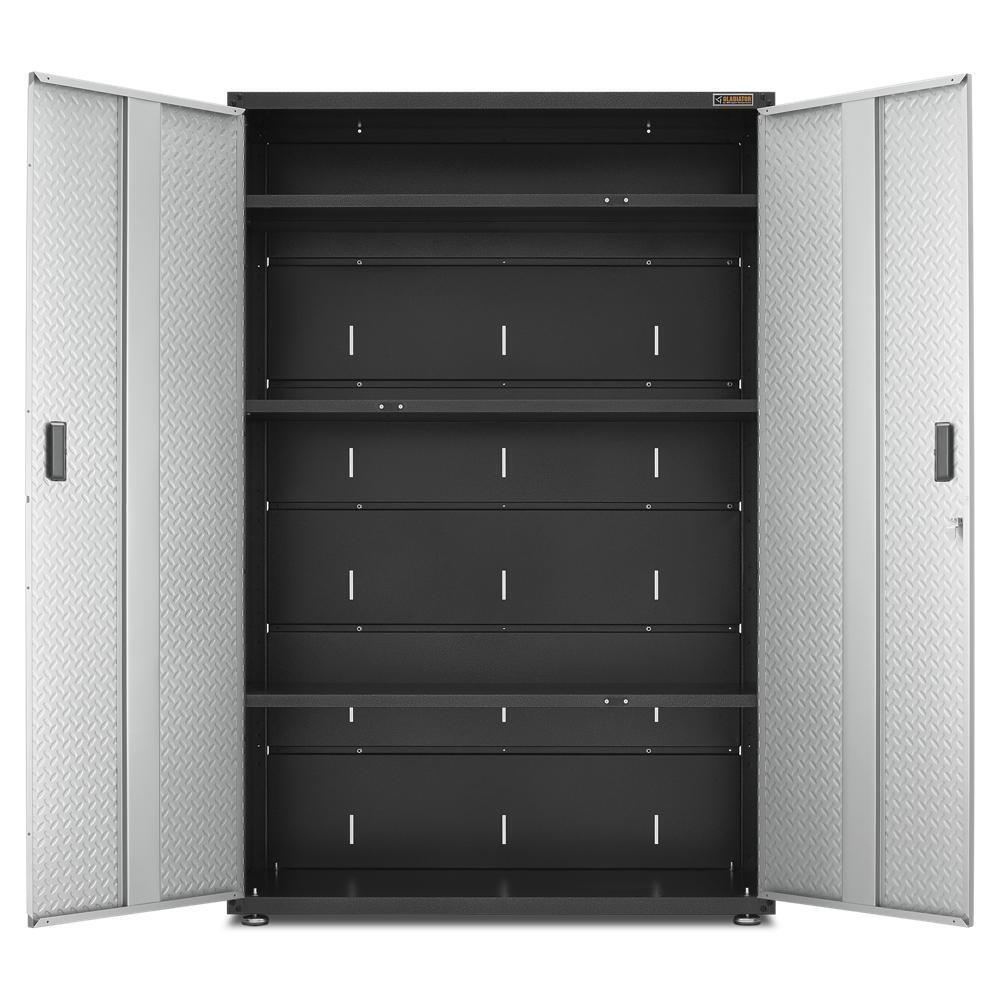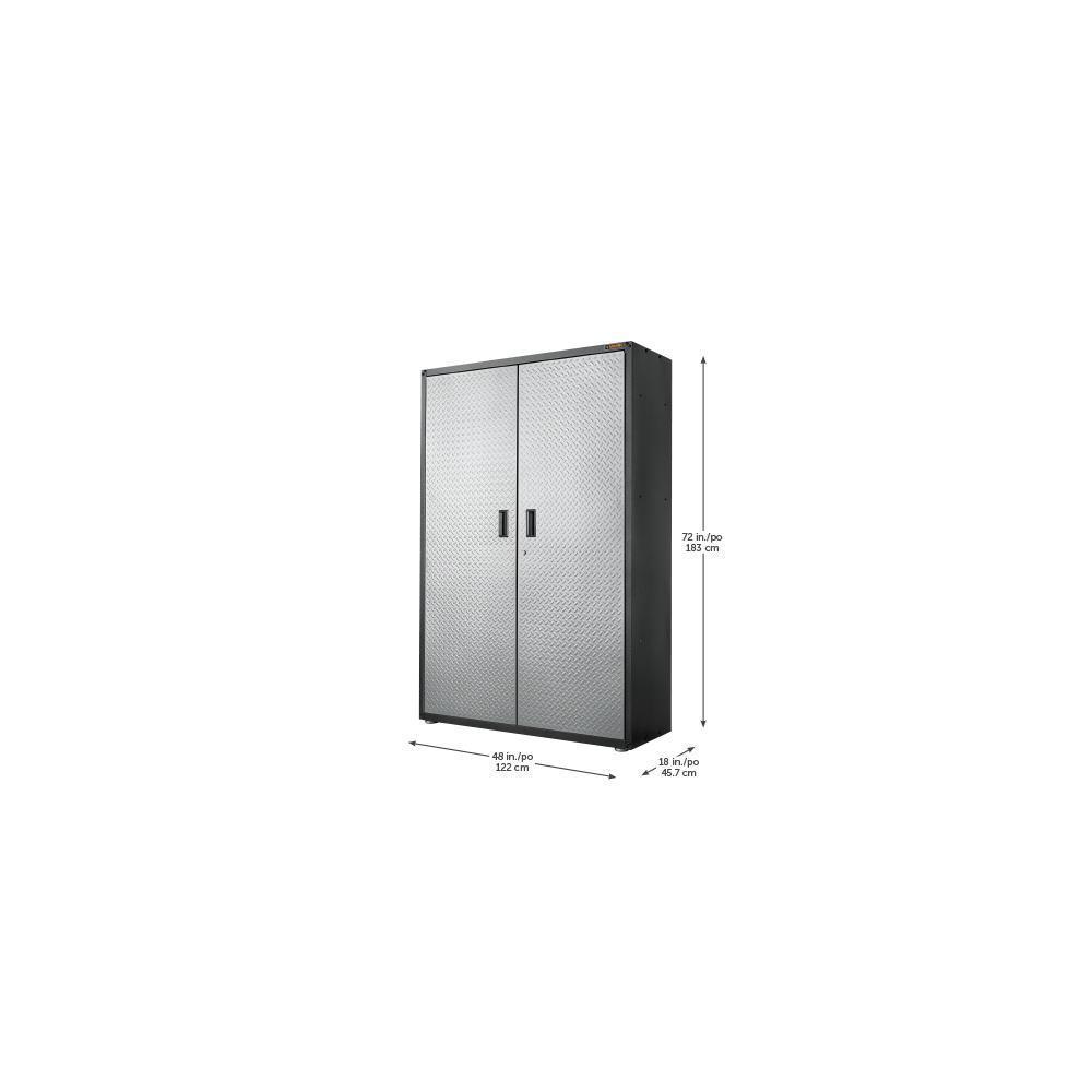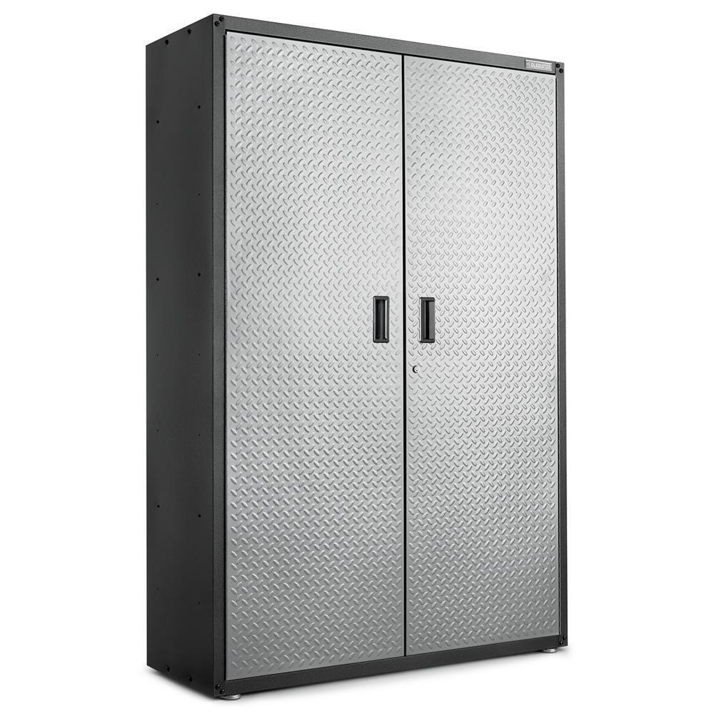 At six-feet tall, 4-feet wide and one-and-a-half feet deep, the Ready-to-Assemble Extra Large GearBox accommodates supplies of various sizes. Store four levels of gardening tools, paint supplies or automotive gear in this sturdy storage cabinet. The design makes assembly fast and easy, while an optional Wall Bracket Kit lets you get the cabinet off the floor using Gladiator® Wall Systems. Not compatible with caster kit.