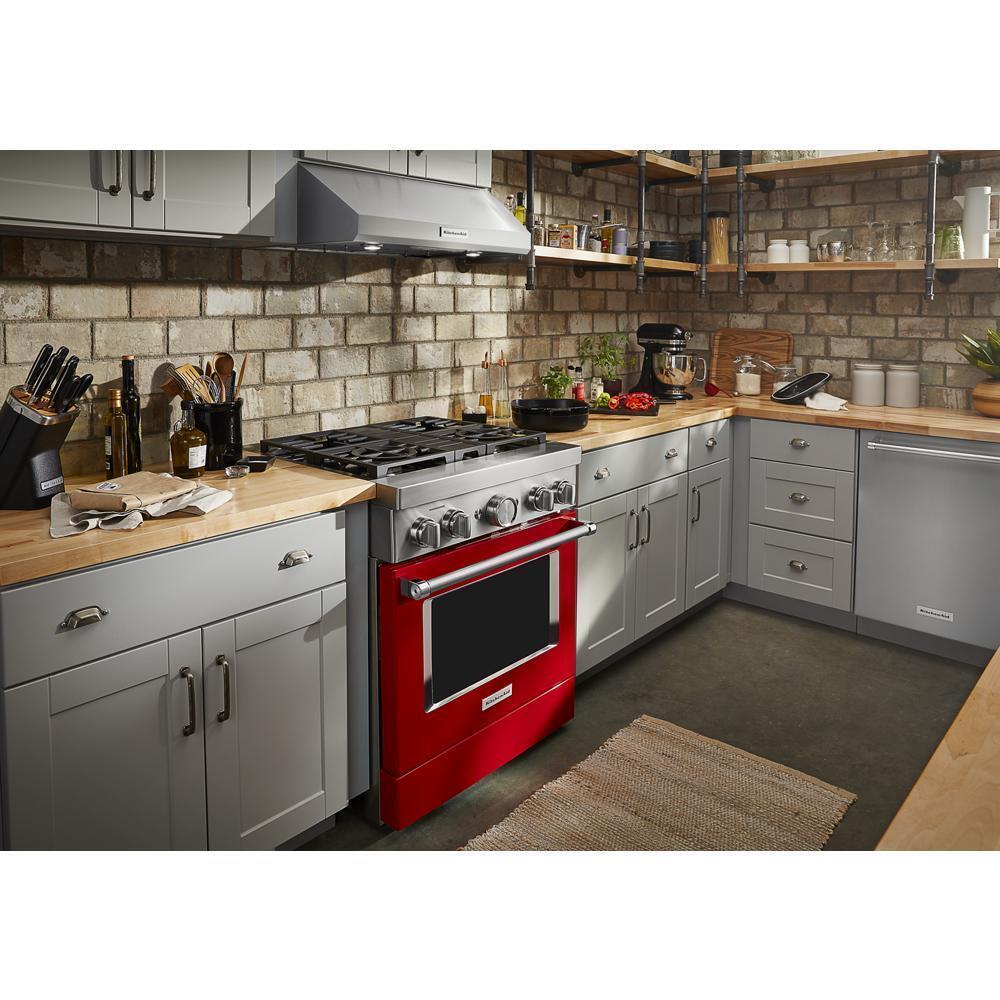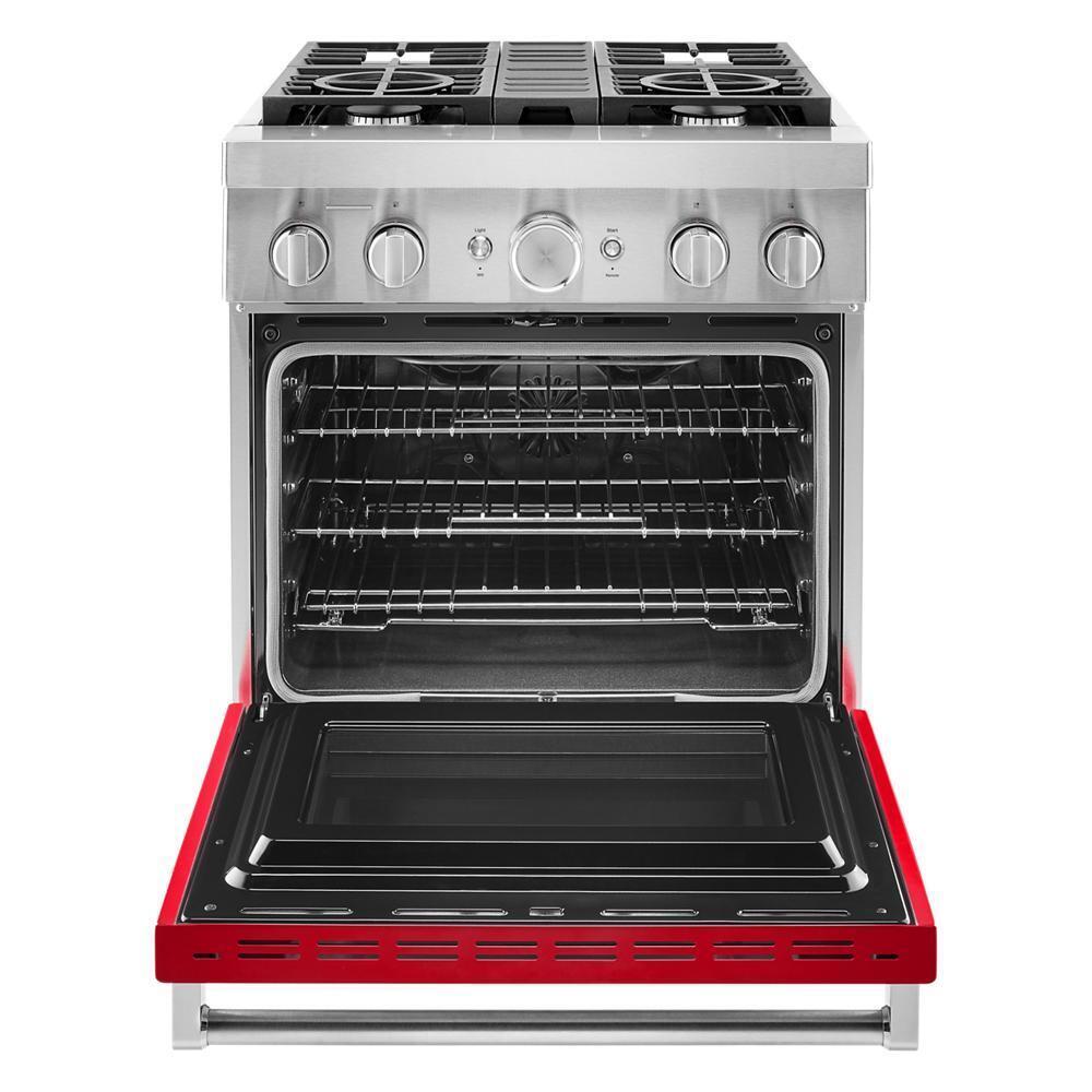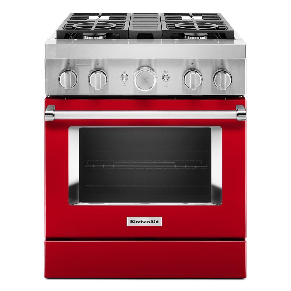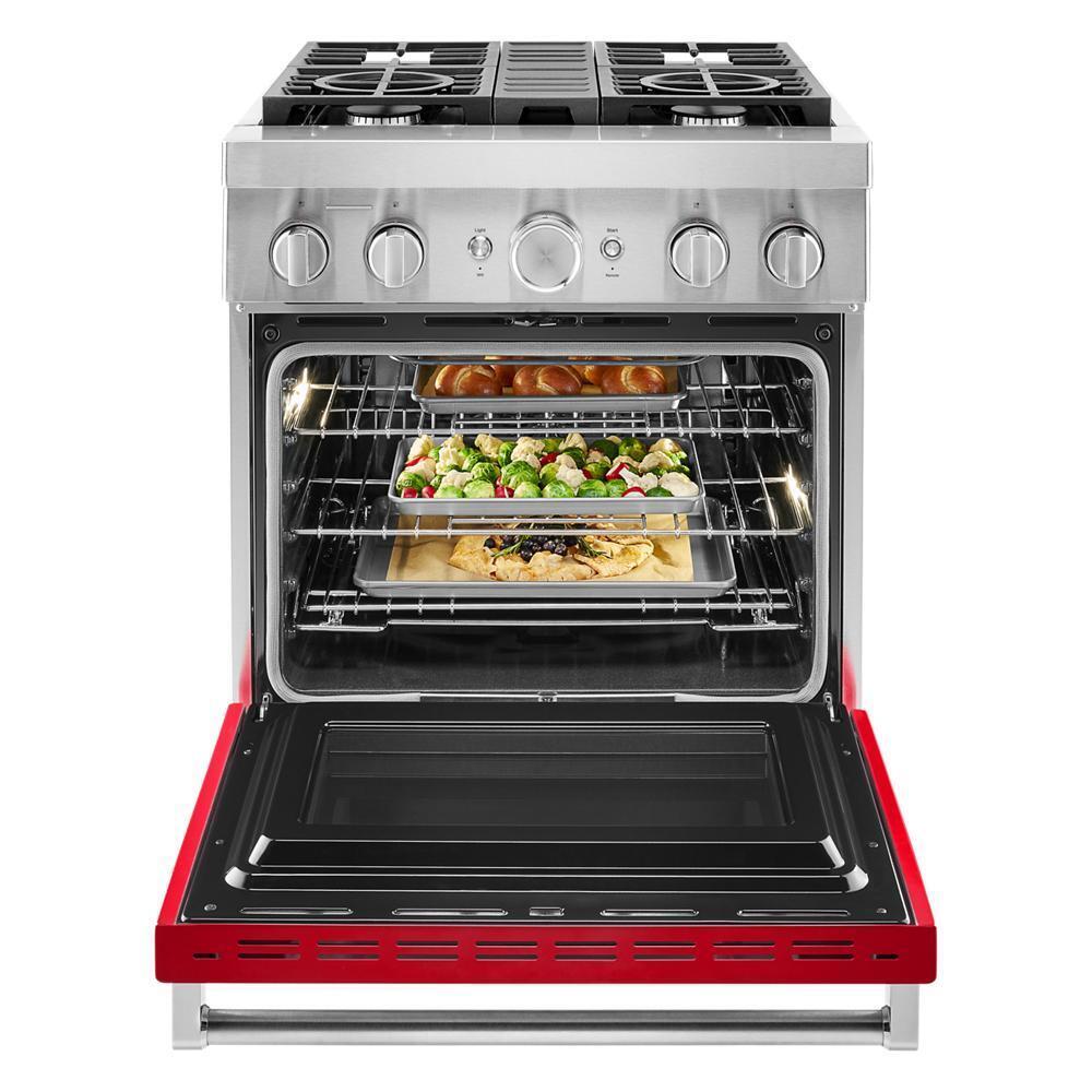 Empower your creativity with a 30-inch KitchenAid® Commercial Style Range with 4 burners. This dual fuel range combines a gas cooktop with the even baking of an electric oven. Two versatile 20,000 BTU Ultra Power™ Dual-Flame Burners offer the power and precision to sear, simmer, stir-fry and saut(eback). Even-Heat™ True Convection helps you achieve more consistent baking and roasting.