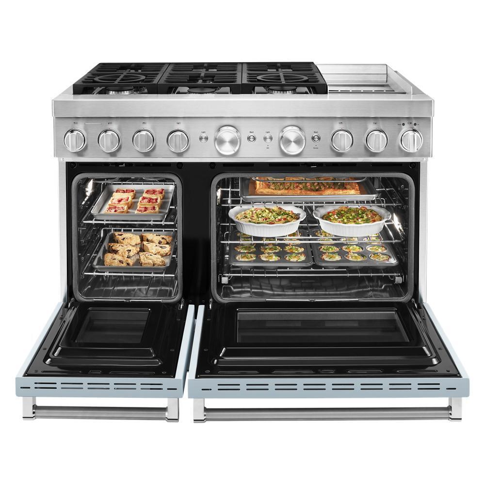 Satisfy your craving to create with a 48-inch KitchenAid® Commercial-Style Range with Even-Heat™ Chrome Electric Griddle. This dual fuel range combines an electric double oven with a 6-burner gas cooktop. Two 20,000 BTU Ultra Power™ Dual-Flame Burners offer power and precision to successfully sear, simmer, stir-fry and saut(eback). Even-Heat™ True Convection helps you achieve more consistent baking and roasting.