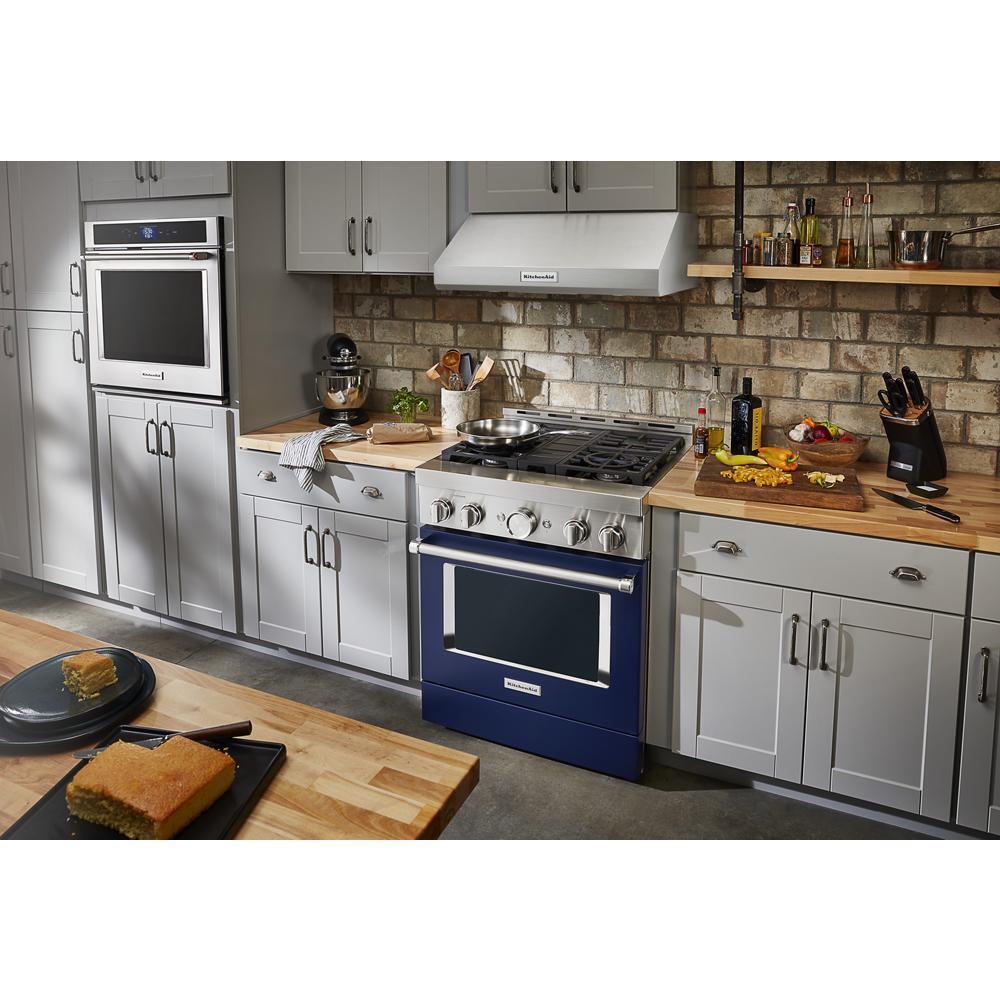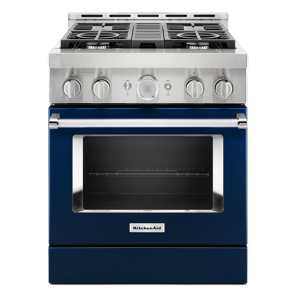 Empower your creativity with a 30-inch KitchenAid® Commercial Style Range with 4 burners. This gas range features two versatile 20,000 BTU Ultra Power™ Dual-Flame Burners with the power and precision needed to successfully sear, simmer, stir-fry and saut(eback). Even-Heat™ True Convection helps you achieve more consistent baking and roasting.