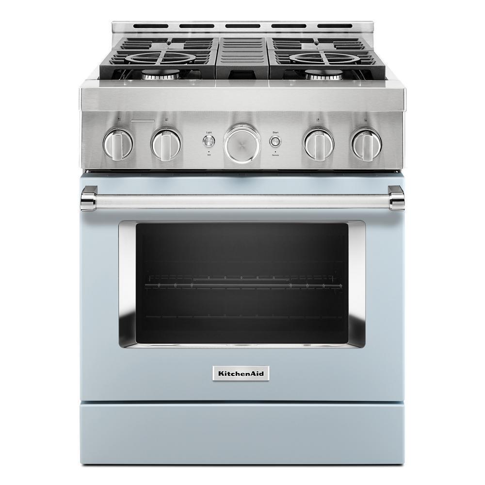Empower your creativity with a 30-inch KitchenAid® Commercial Style Range with 4 burners. This gas range features two versatile 20,000 BTU Ultra Power™ Dual-Flame Burners with the power and precision needed to successfully sear, simmer, stir-fry and saut(eback). Even-Heat™ True Convection helps you achieve more consistent baking and roasting.