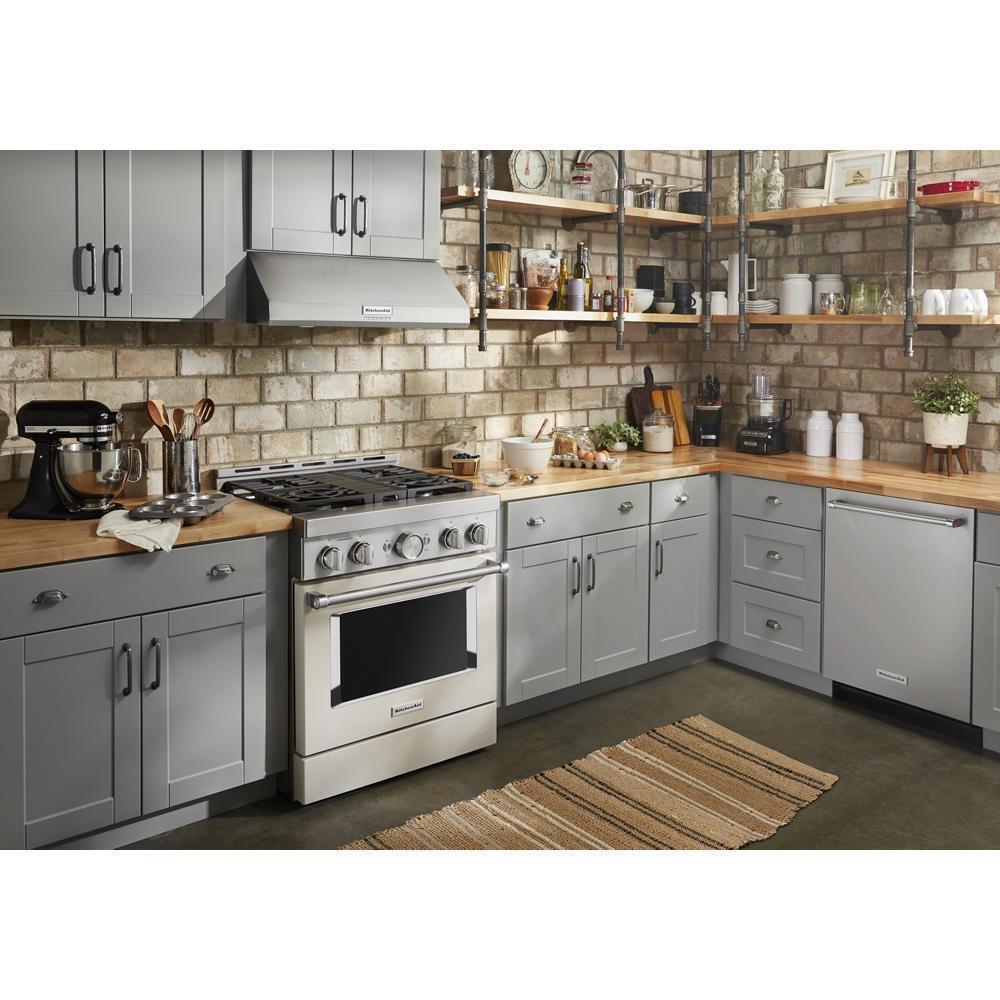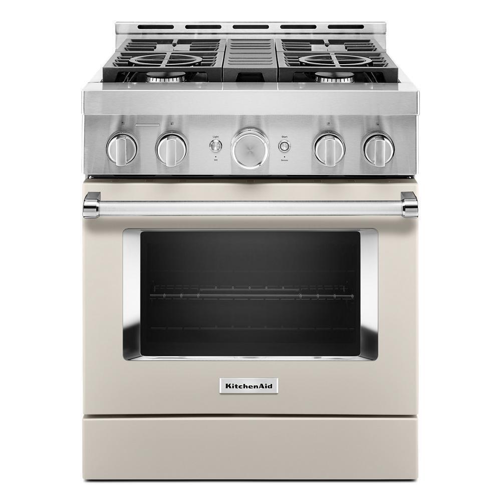 Empower your creativity with a 30-inch KitchenAid® Commercial Style Range with 4 burners. This gas range features two versatile 20,000 BTU Ultra Power™ Dual-Flame Burners with the power and precision needed to successfully sear, simmer, stir-fry and saut(eback). Even-Heat™ True Convection helps you achieve more consistent baking and roasting.