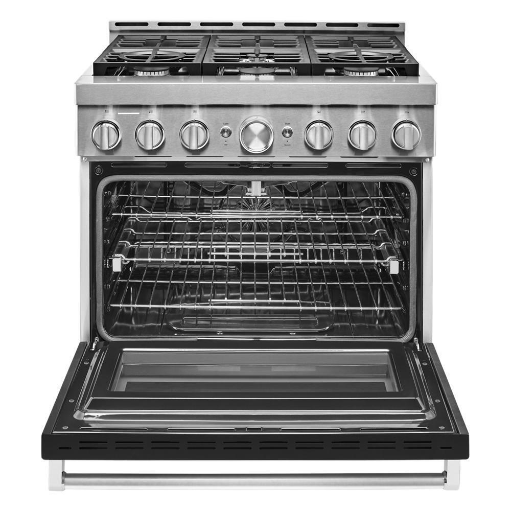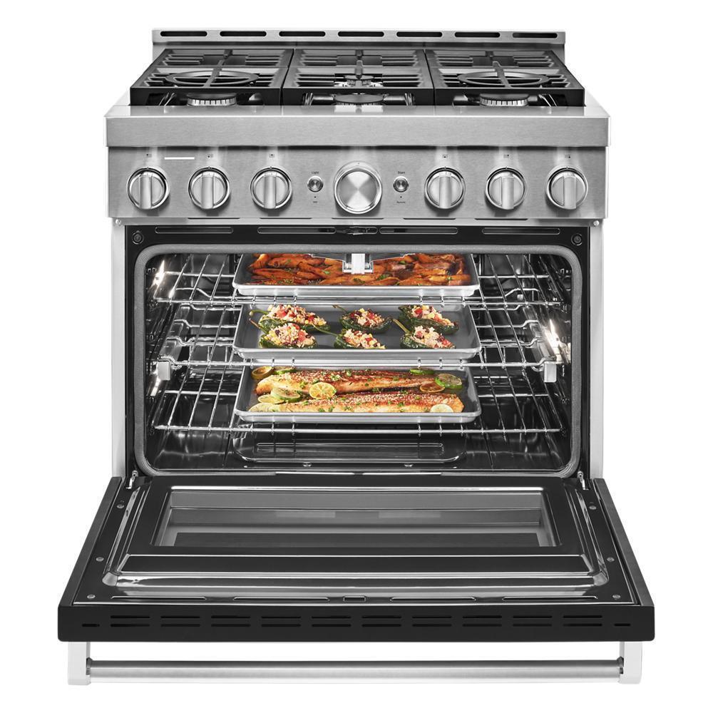 Expand your skills with a 36-inch KitchenAid® Commercial Style Range with 6 burners. This gas range features two versatile 20,000 BTU Ultra Power™ Dual-Flame Burners with the power and precision needed to successfully sear, simmer, stir-fry and saut(eback). Even-Heat™ True Convection helps you achieve more consistent baking and roasting.