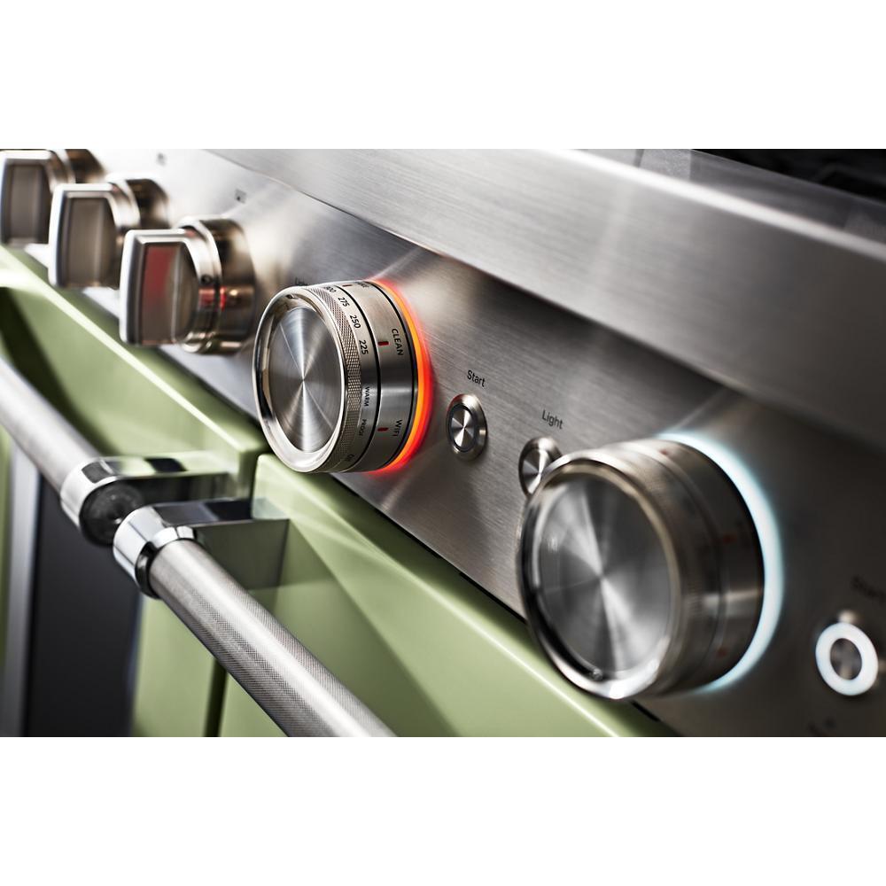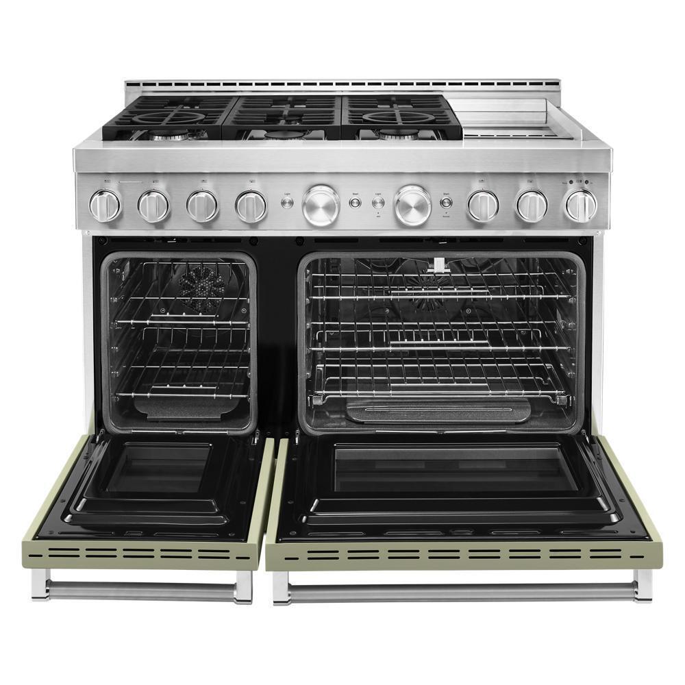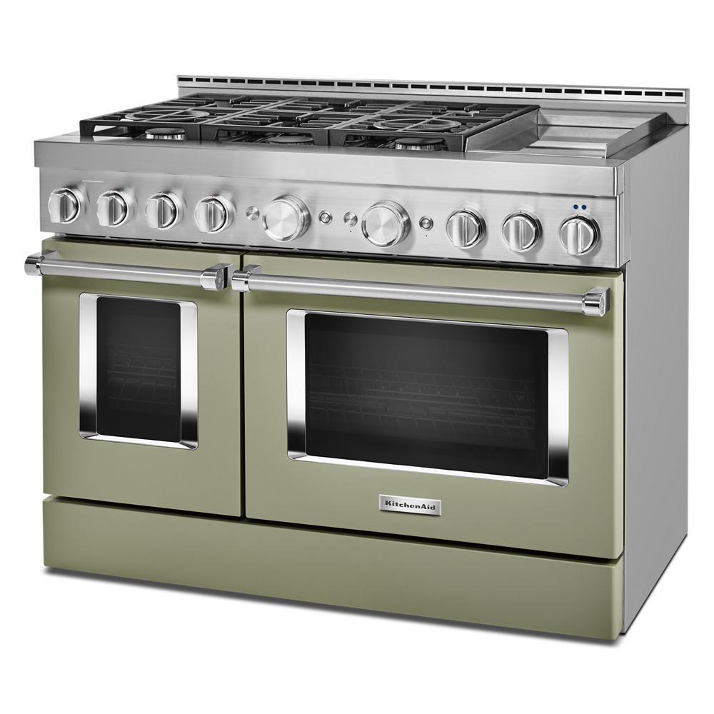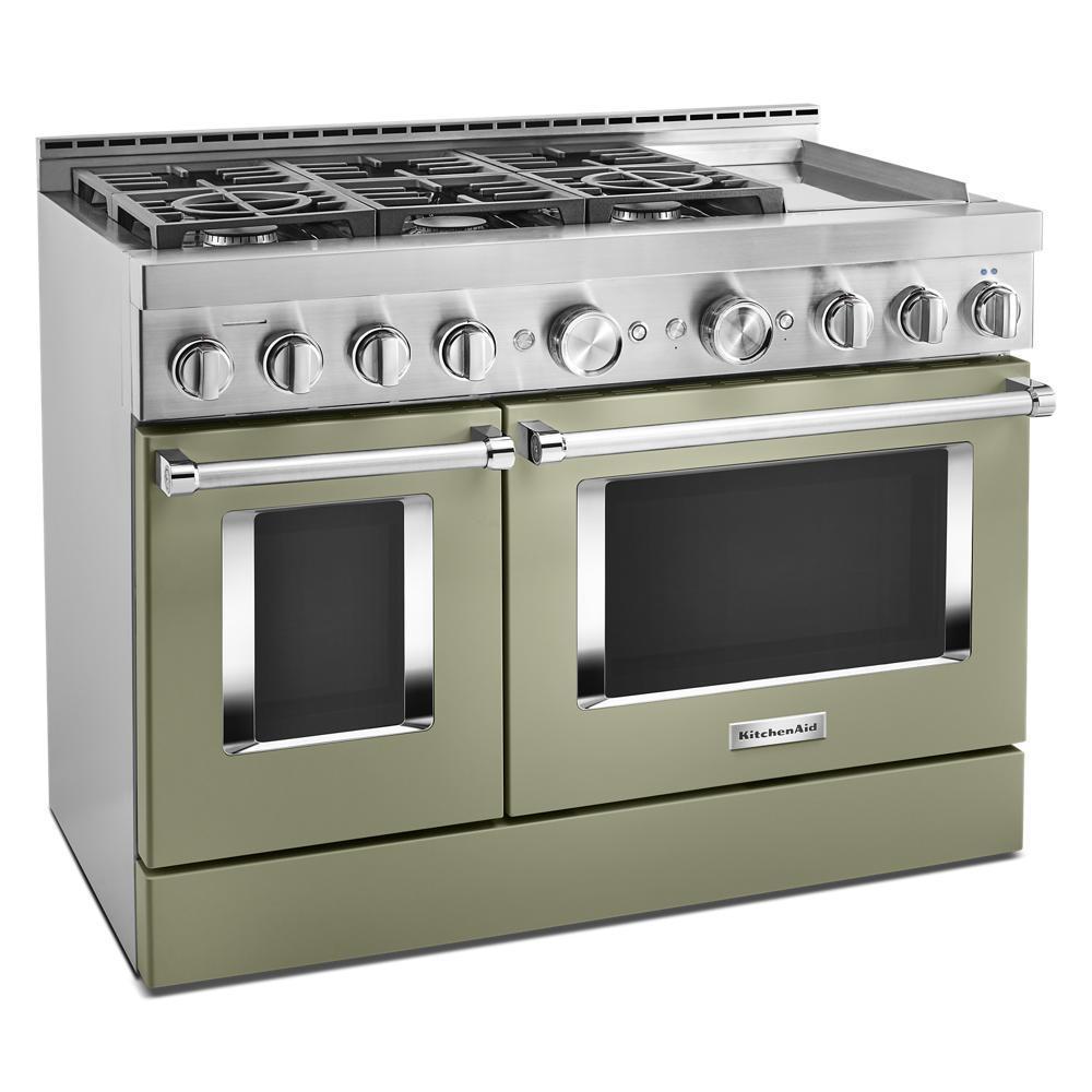 Satisfy your craving to create with a 48-inch KitchenAid® Commercial-Style Range with Even-Heat™ Chrome Electric Griddle. This 6-burner gas range features two versatile 20,000 BTU Ultra Power™ Dual-Flame Burners with the power and precision to successfully sear, simmer, stir-fry and saut(eback). The double oven with Even-Heat™ True Convection helps you achieve more consistent baking and roasting.