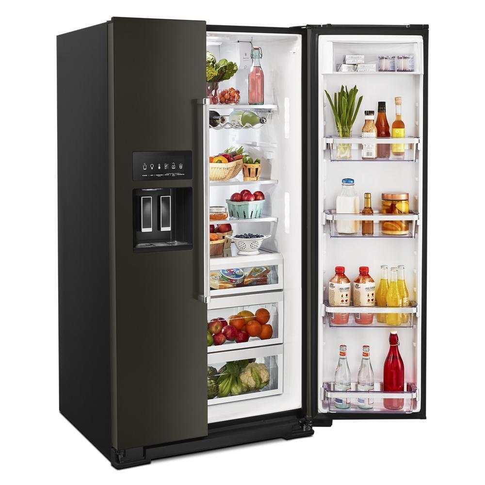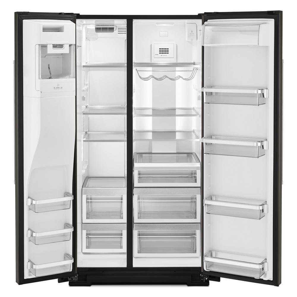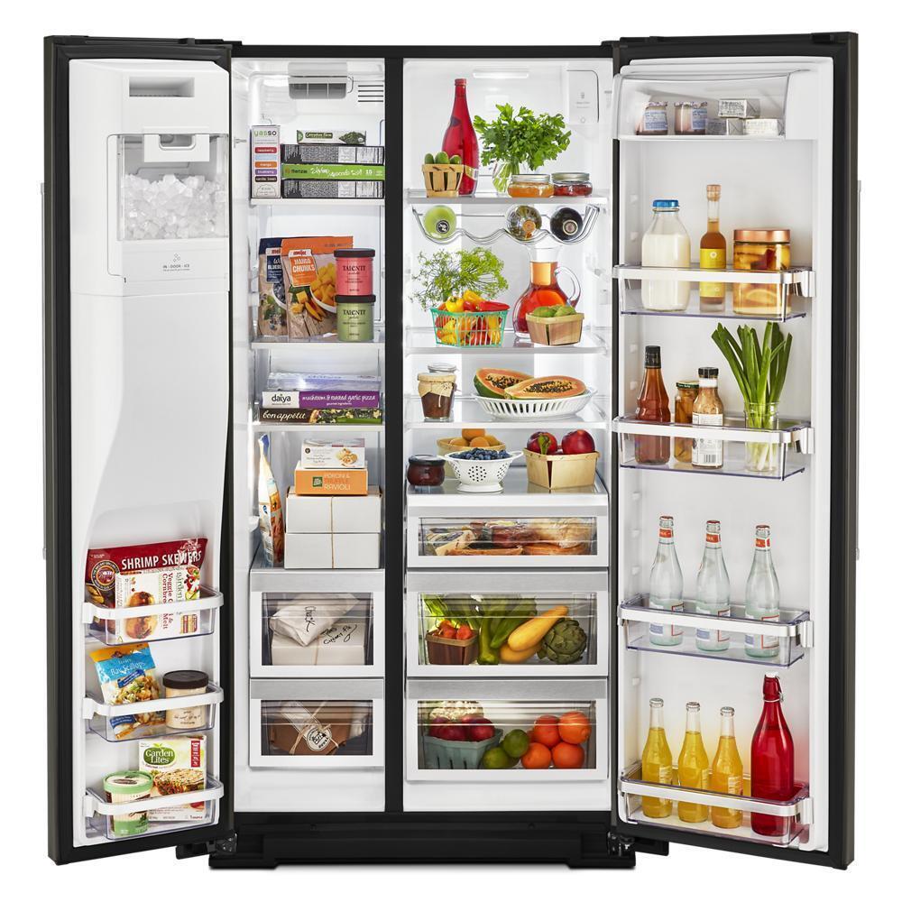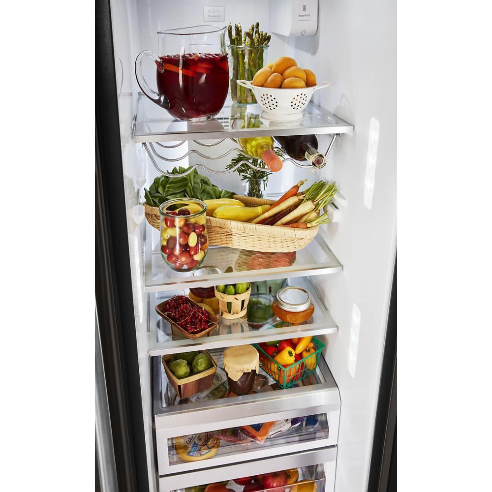 This 24.8 cu ft. side-by-side refrigerator features the Preserva® Food Care System. Its two independent cooling systems help keep food fresh while the FreshFlow™ Air Filter minimizes odors, and the Produce Preserver delays over-ripening. PrintShield™ Finish on the stainless steel exterior resists fingerprints and smudges for easy cleaning.