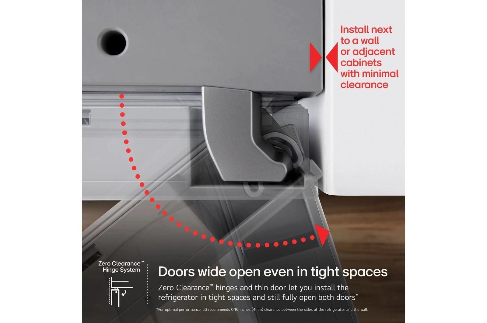 - Zero Clearance™ hinges and thin door design let you install the refrigerator in tight spaces and still fully open both doors.
