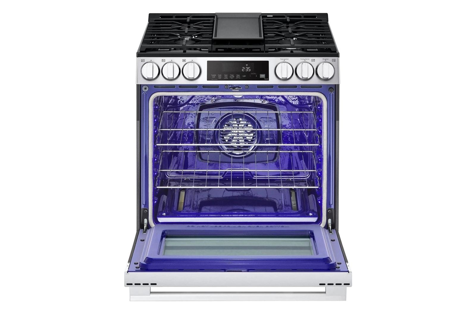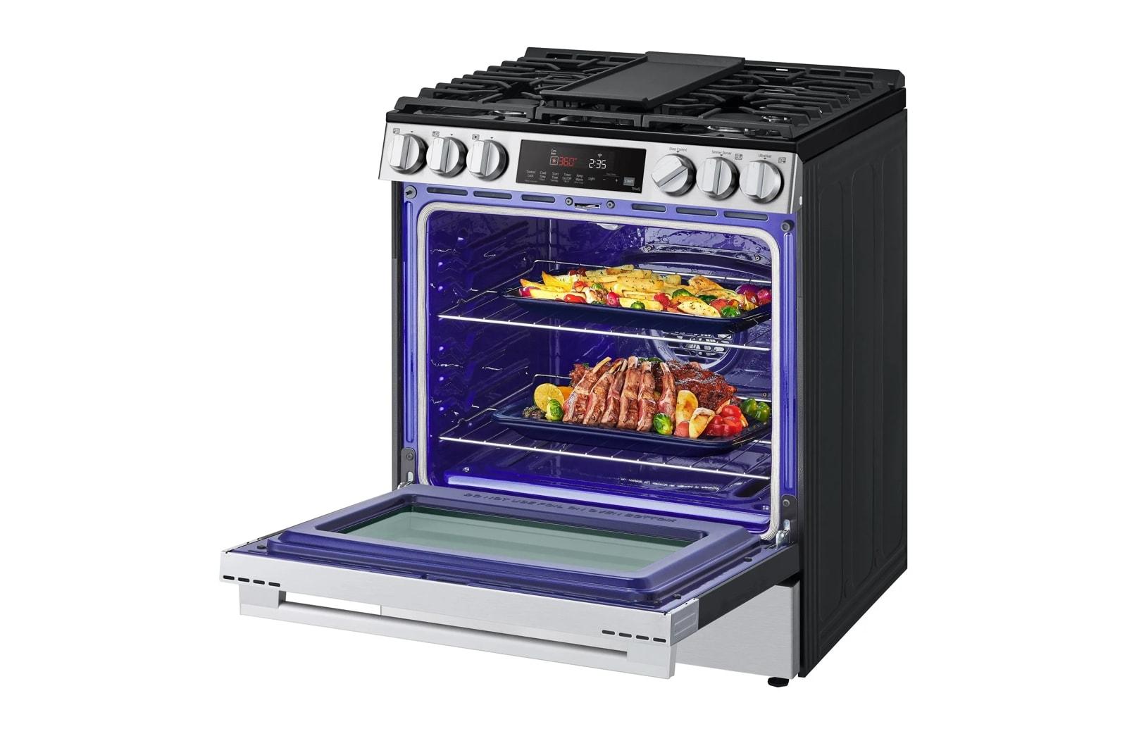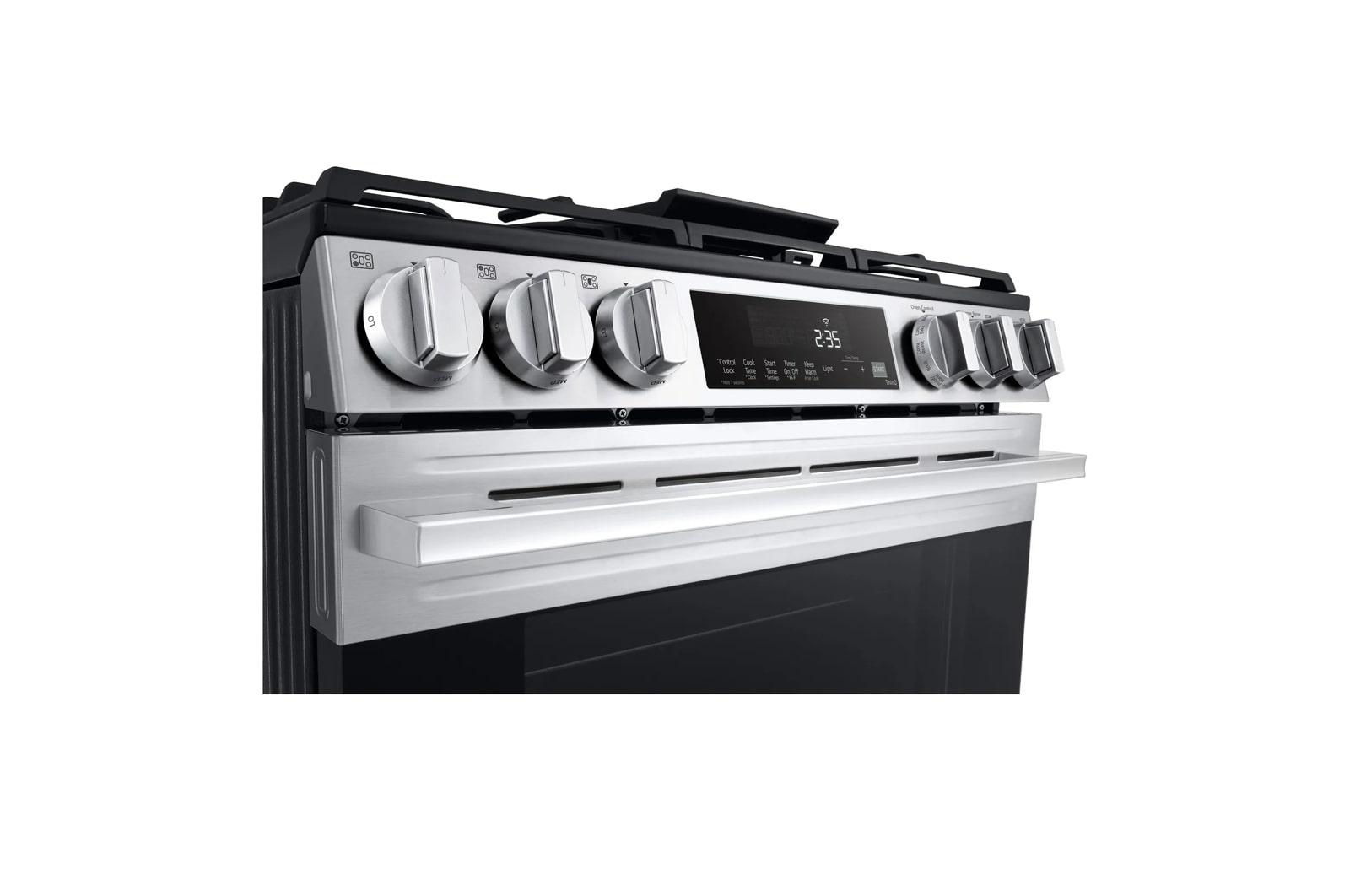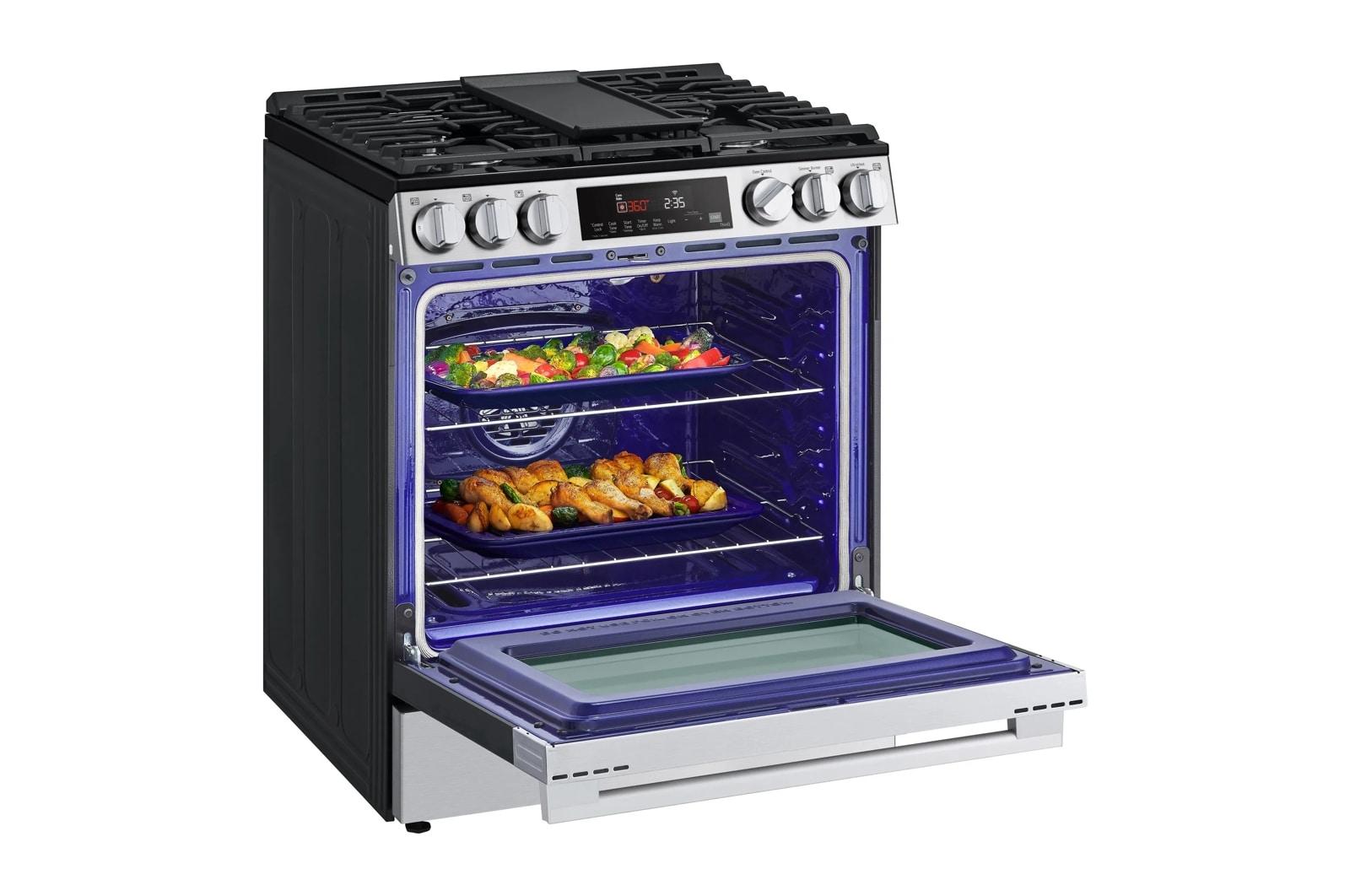 5.8 cu.ft. Smart Gas Single Oven Slide-in Range, Air Fry, Fan Convection, EasyClean®, Self Clean, ThinQ®, Printproof® Stainless Steel - New Handle