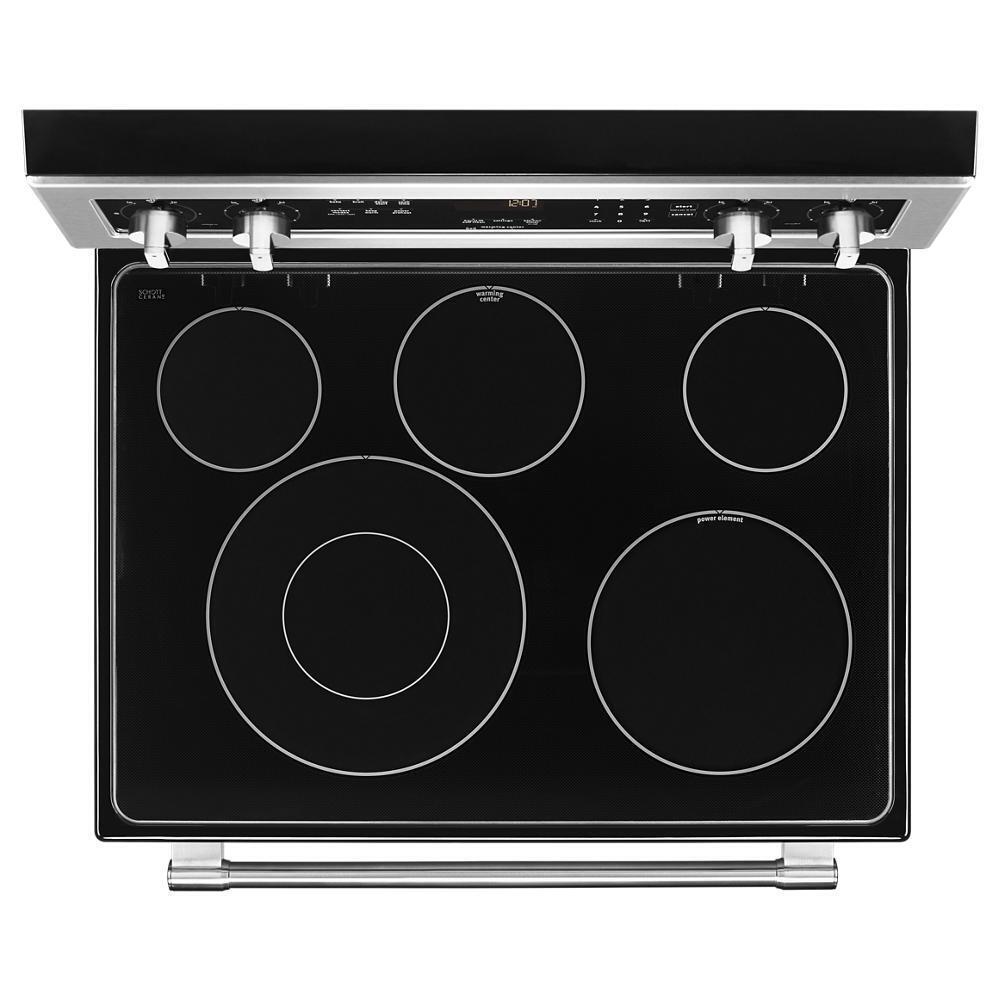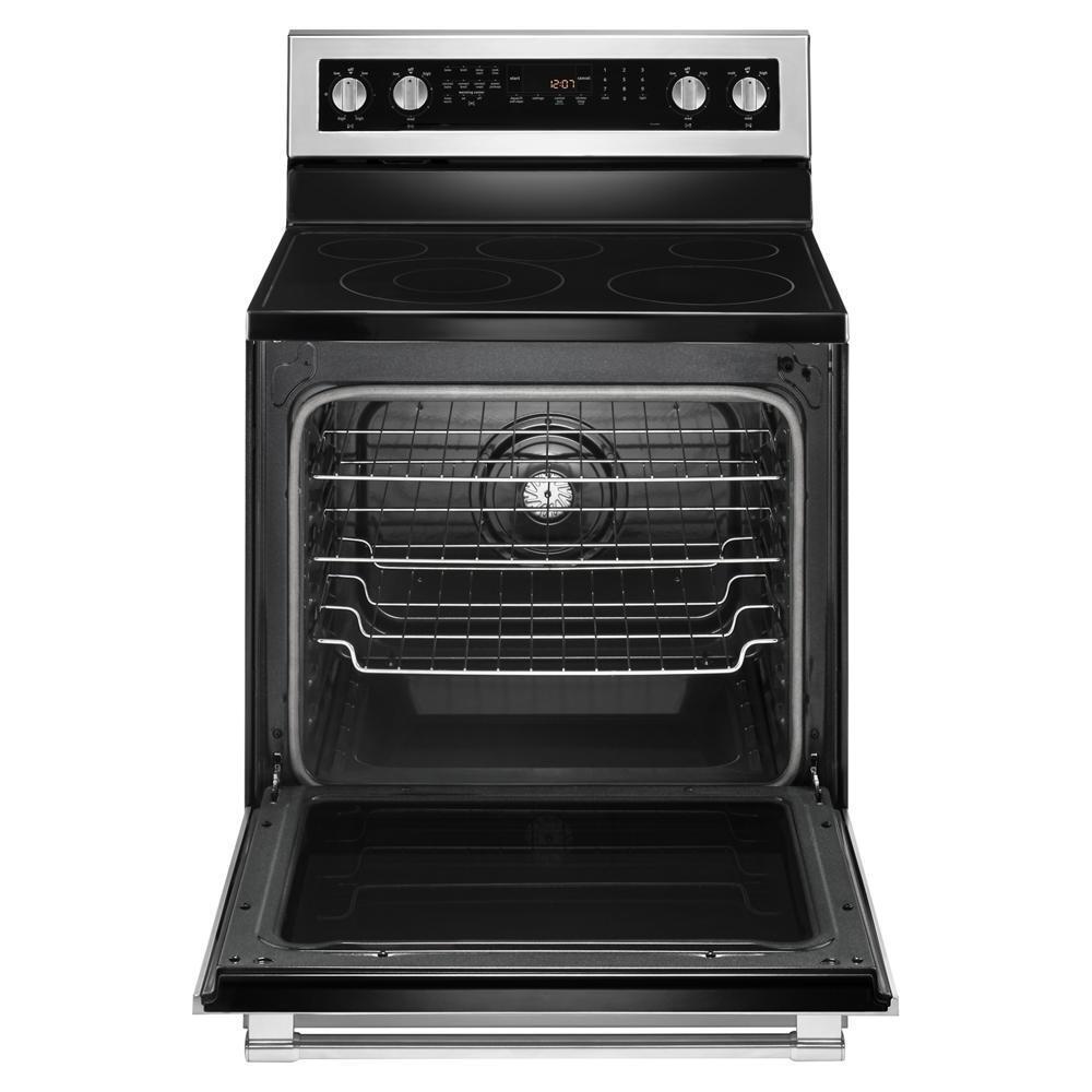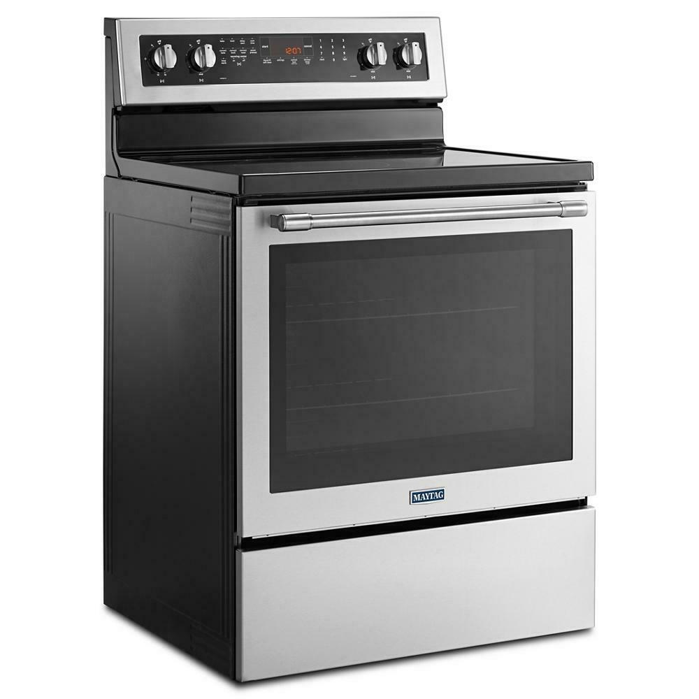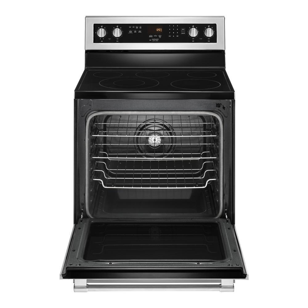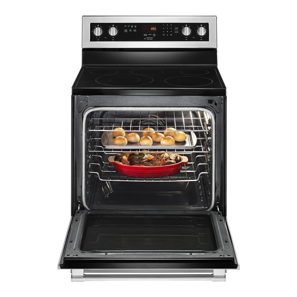 Our electric stove with 5 elements has the power to get all of your favorites sizzling right away, and is available in fingerprint resistant stainless steel. The Power™ element brings the heat for quick searing, while Power Preheat lets you start cooking sooner. For faster baking and roasting, true convection with a third heating element helps keep temperatures consistent. Plus, you can count on this freestanding stove for a decade of dependability thanks to a 10-year limited parts warranty. Best of all, this 6.4 cu. ft. electric stove is designed, engineered and assembled in the U.S.A. with genuine American Pride.